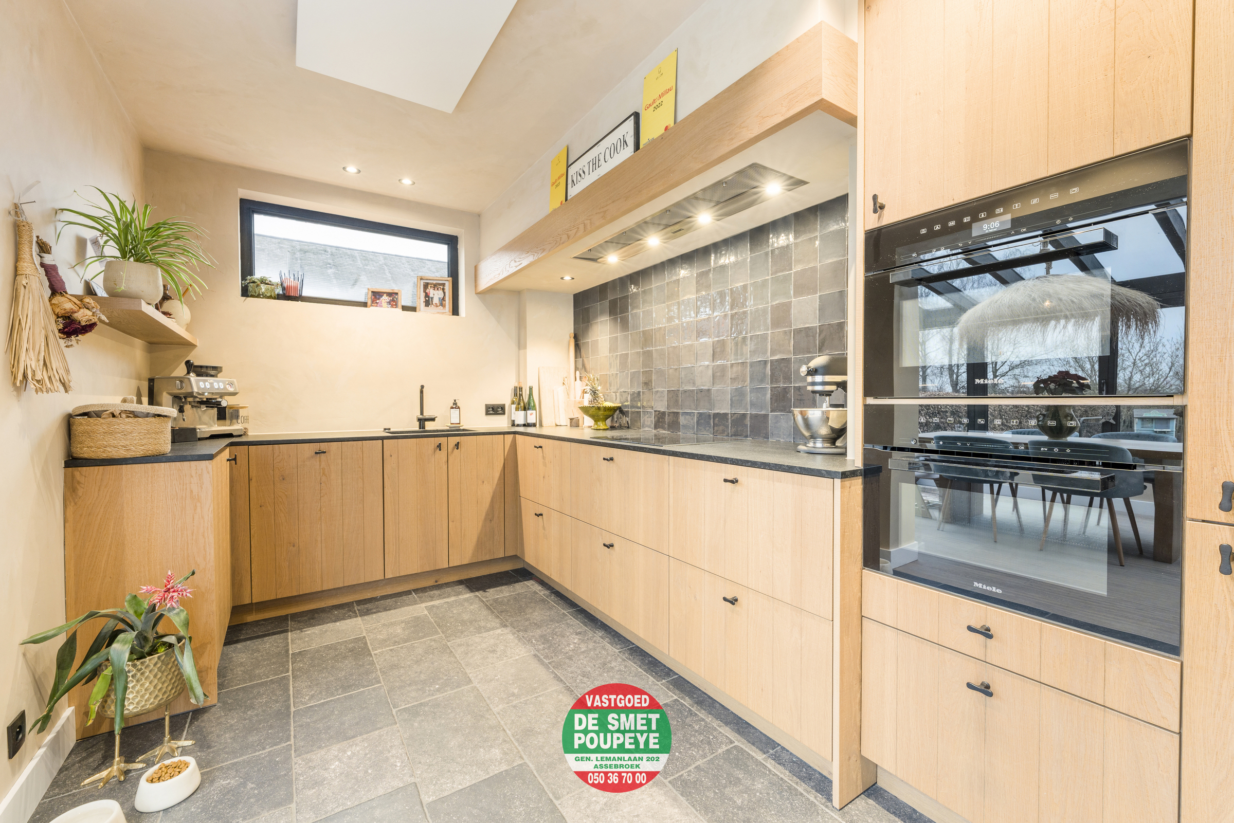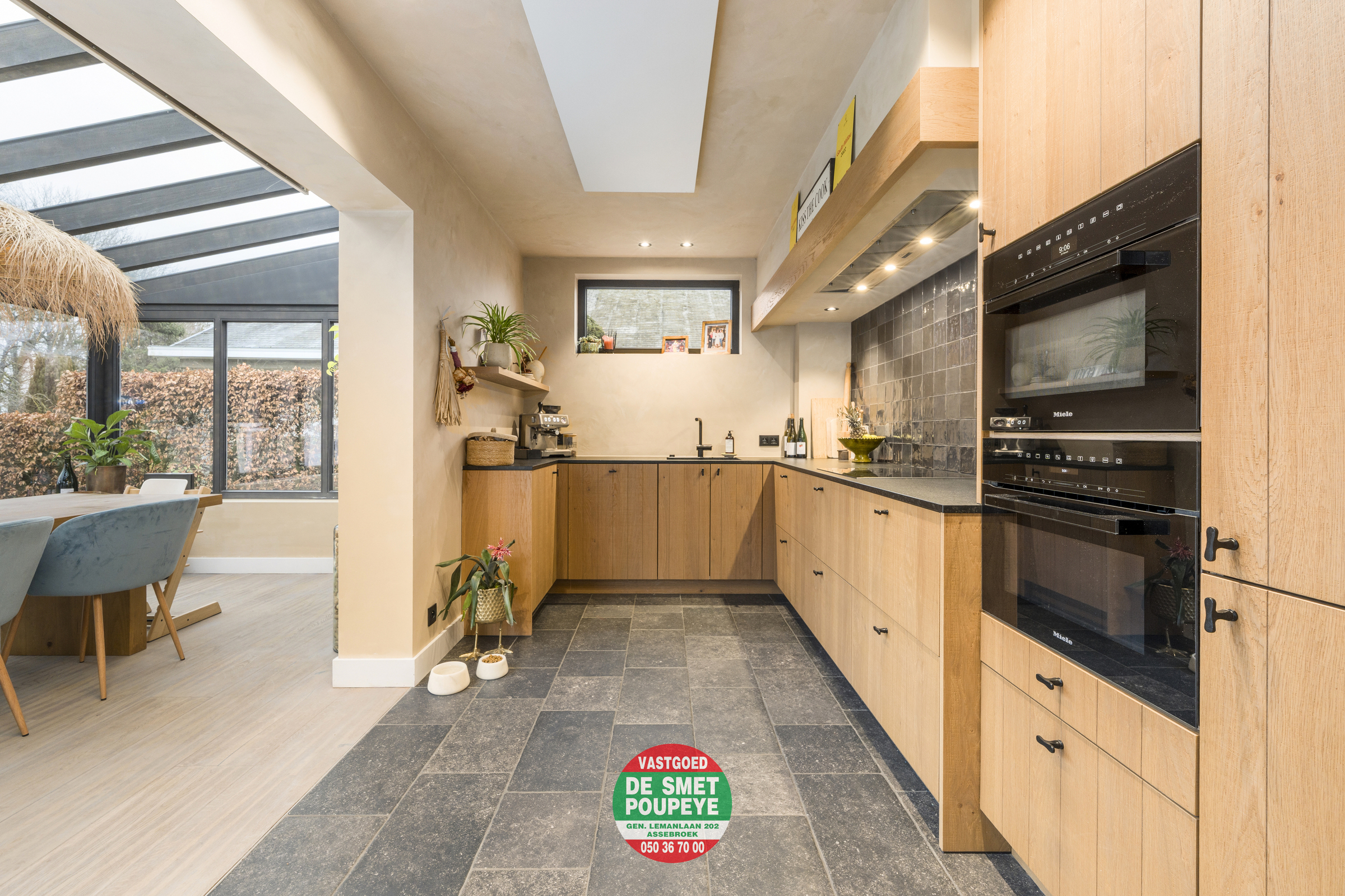 Op het gelijkvloers komt u binnen via een ruime inkomhal met vestiaire, gastentoilet, wasplaats en kelder. Aansluitend bevindt zich de lichtrijke leefruimte, waar het grote raam zorgt voor een mooi zicht en rechtstreeks contact met de zonnige tuin. De open, kwaliteitsvolle keuken is uitgerust met hoogwaardige toestellen en afgewerkt met een elegant granieten werkblad.