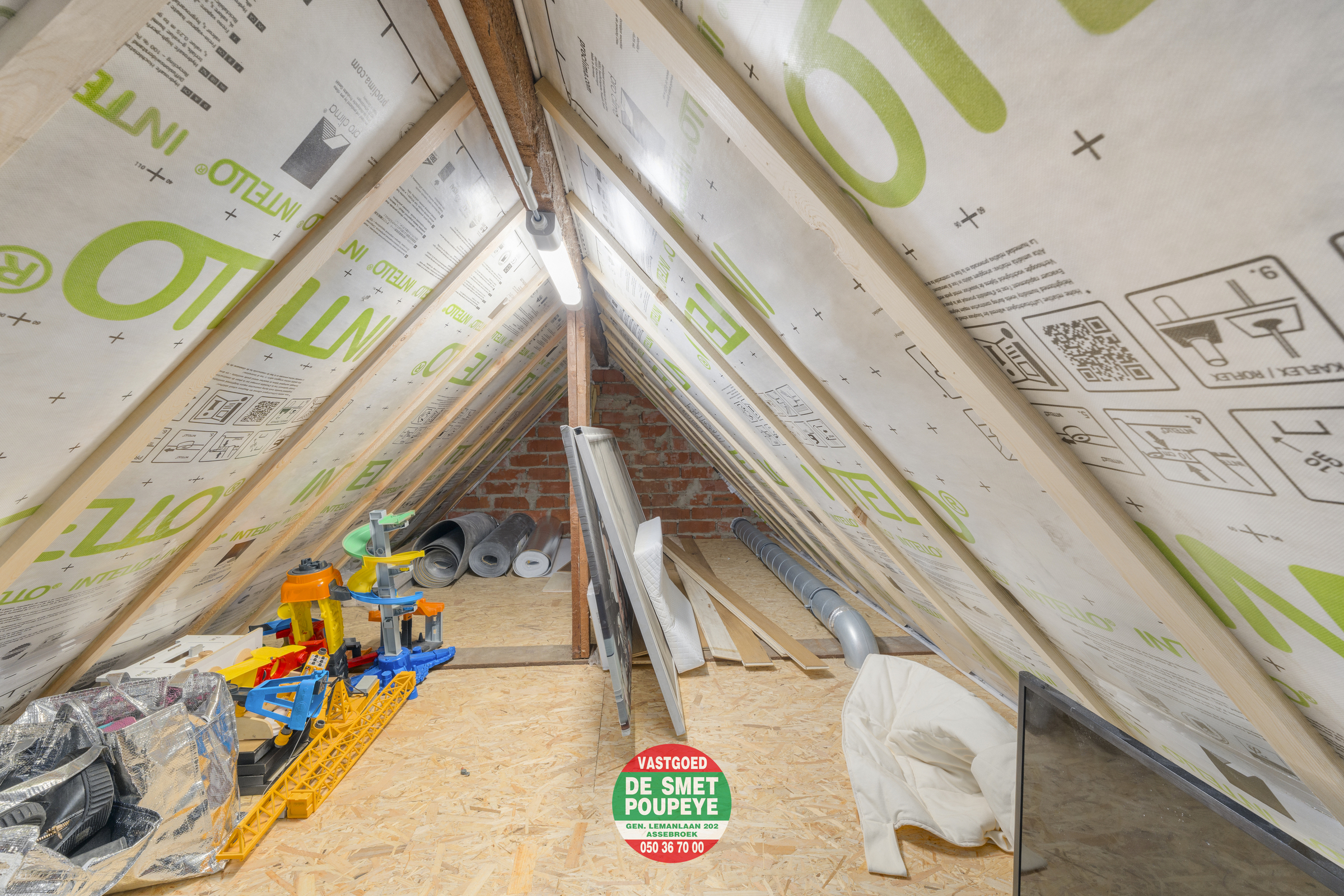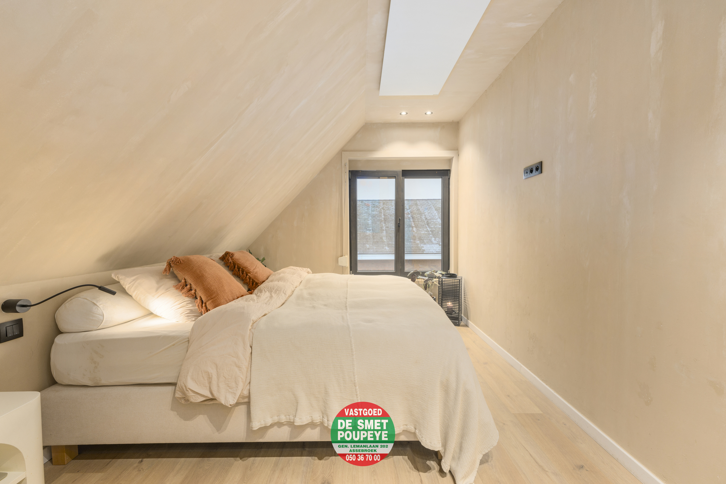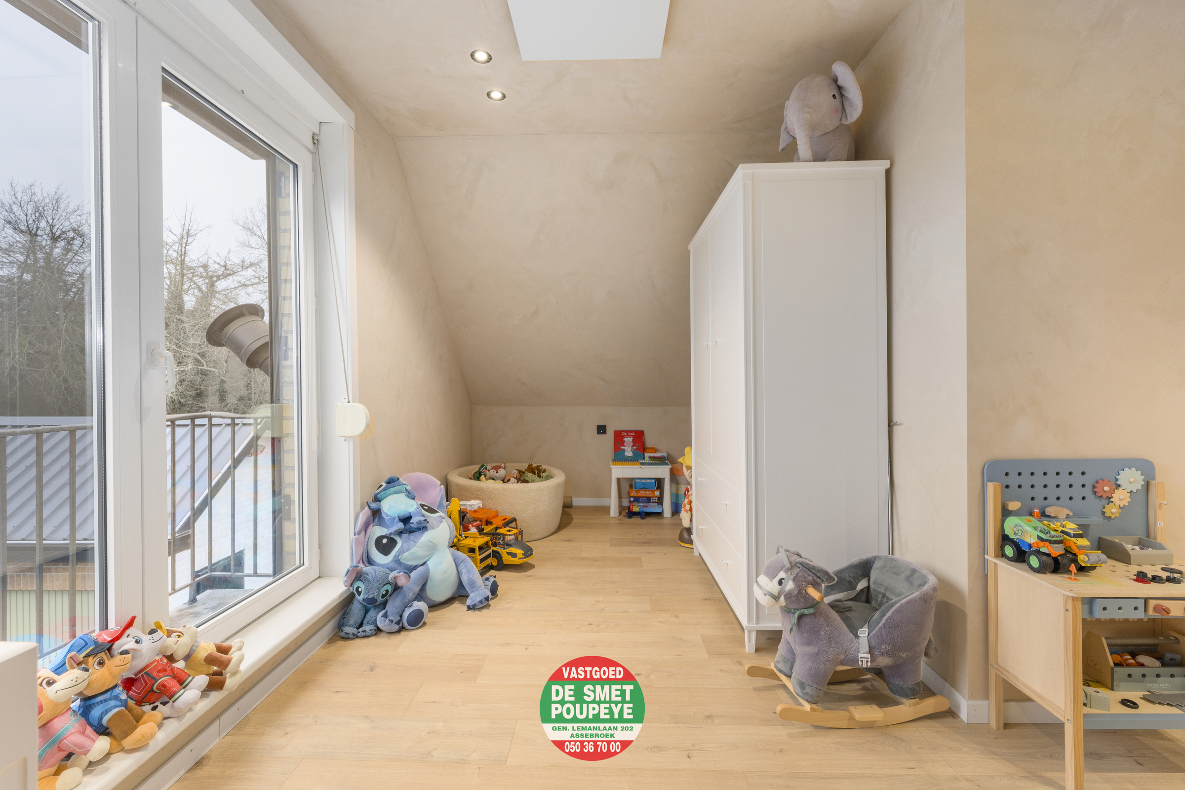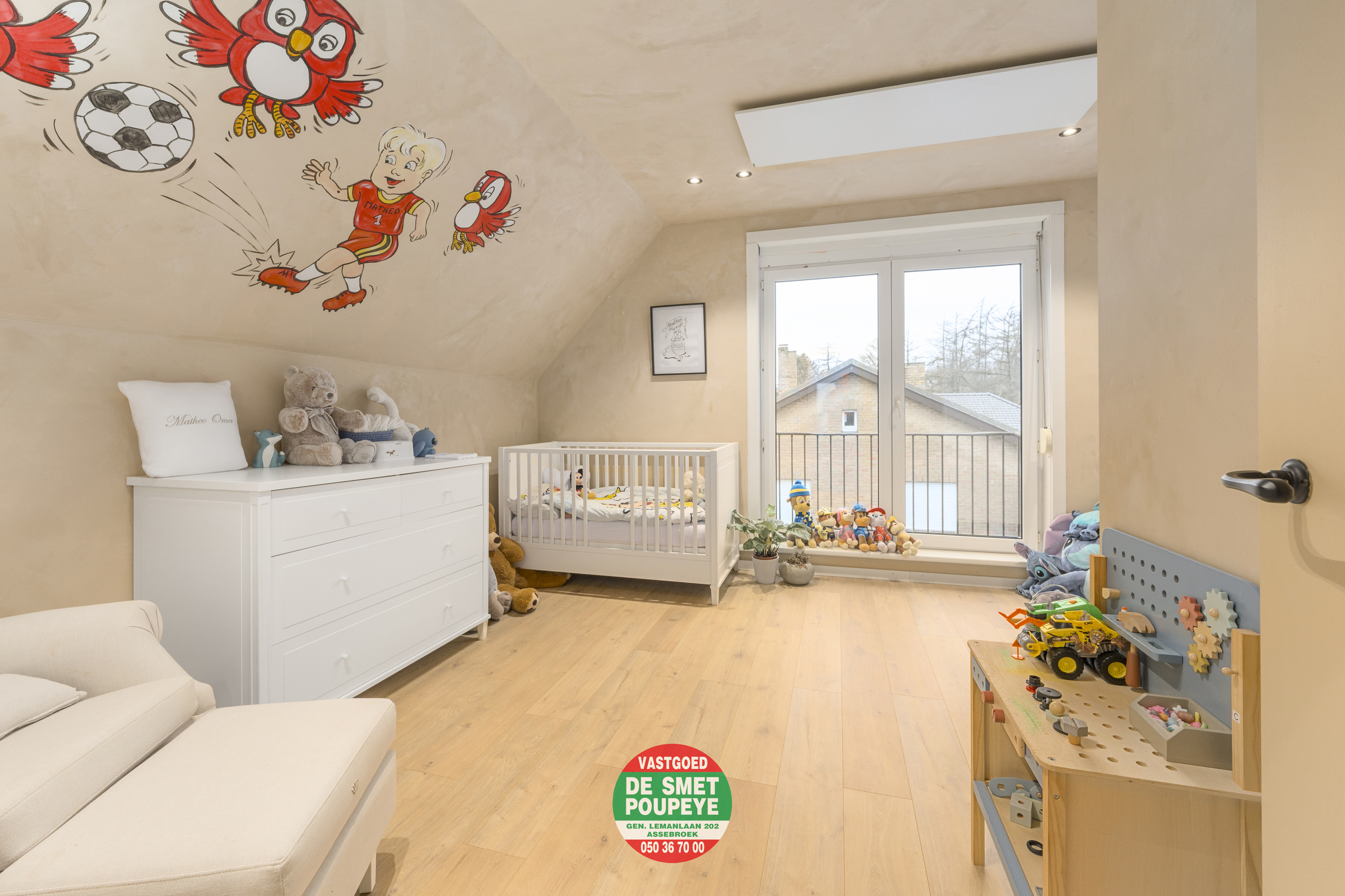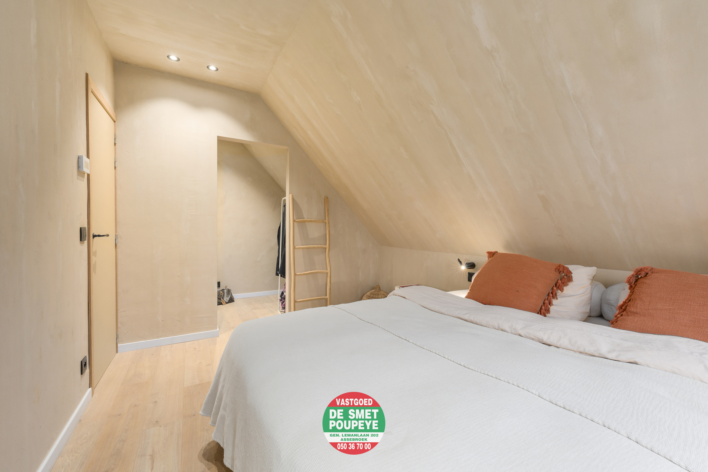 Het eerste verdiep telt twee volwaardige slaapkamers, waarvan de master werd voorzien van een eigen dressing. De badkamer is volledig uitgerust met een inloopdouche, ligbad, dubbele wastafel en toilet. De zolder, bereikbaar via een schuiftrap, biedt extra bergruimte.