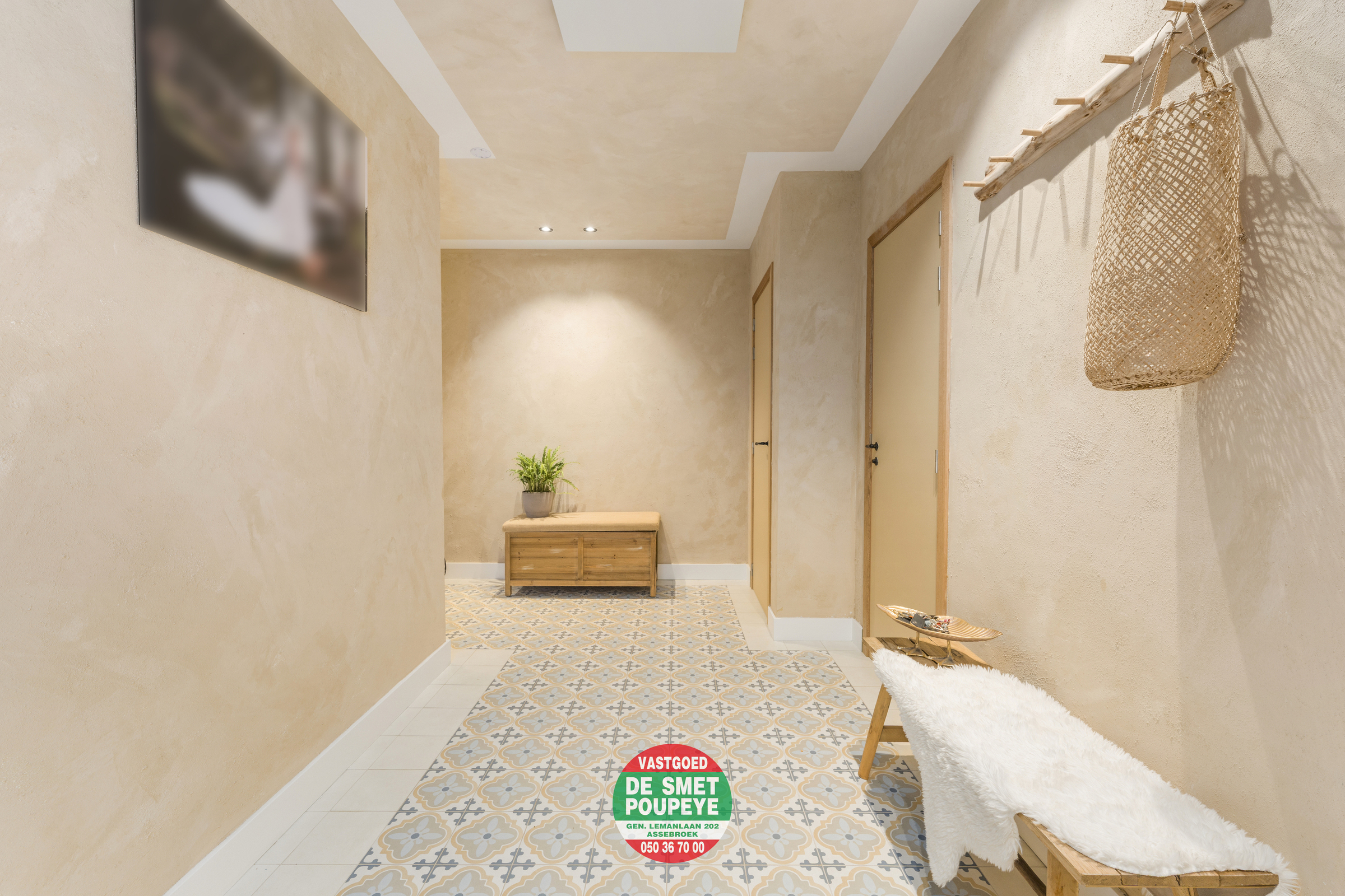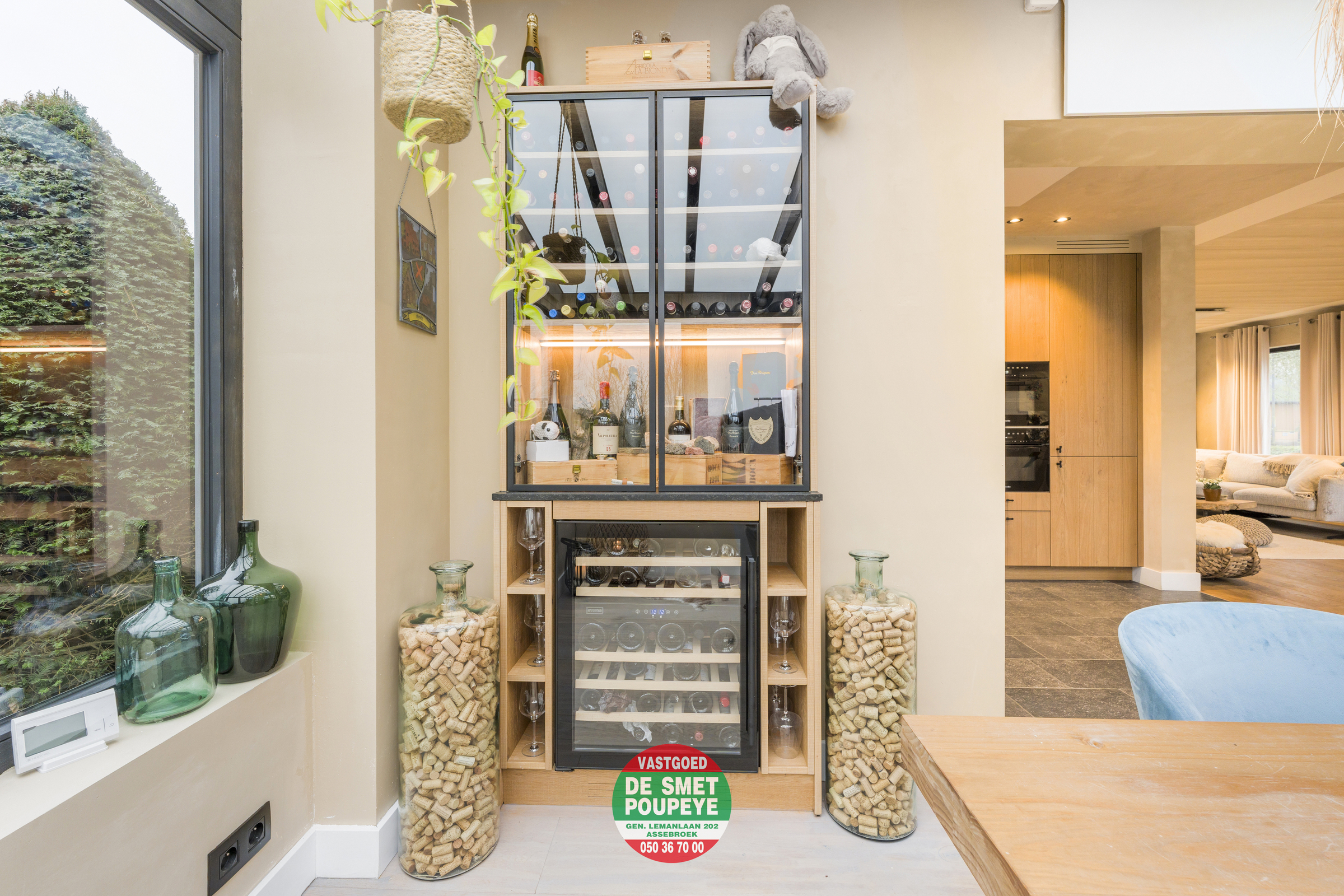 Verder is er een veranda, afgewerkt met een op maat gemaakte kast en wijnfrigo, vervaardigd uit dezelfde materialen als de keuken, wat zorgt voor een mooi geheel. Vanuit hier heeft u toegang tot het nieuw aangelegde terras in natuursteen.