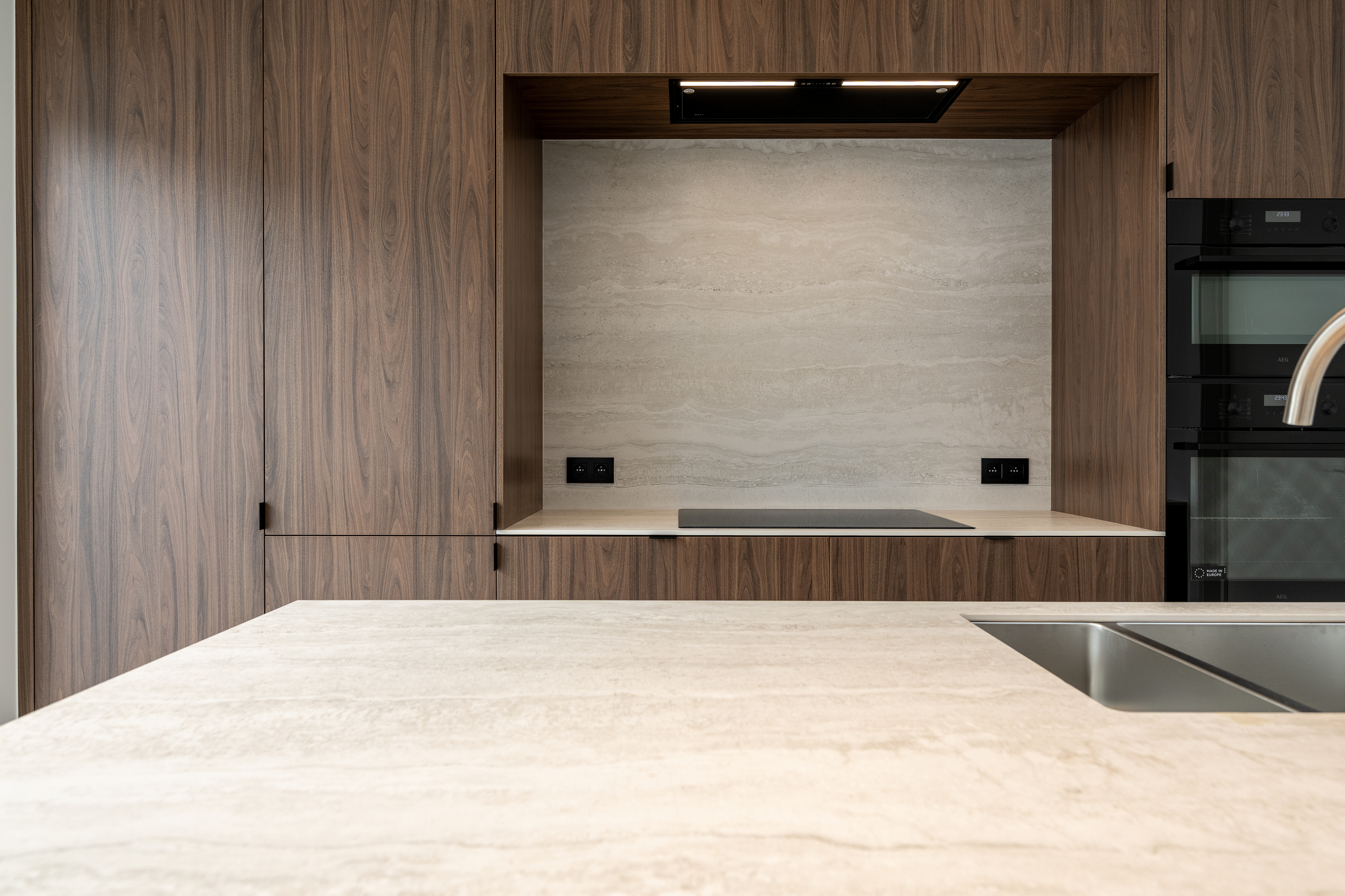 Op het gelijkvloers verwelkomt een ruime inkomhal met vestiaire op maat, een gastentoilet en een praktische berging onder de trap. De leefruimte met extra hoge plafonds en parketvloer sluit naadloos aan op de luxueuze open keuken met kookeiland, afgewerkt in keramische steen en uitgerust met hoogwaardige AEG-toestellen (inductiekookplaat, oven, microgolf, vaatwasser, koelkast en aparte diepvries). Aansluitend bevindt zich een aparte wasplaats/keukenberging.