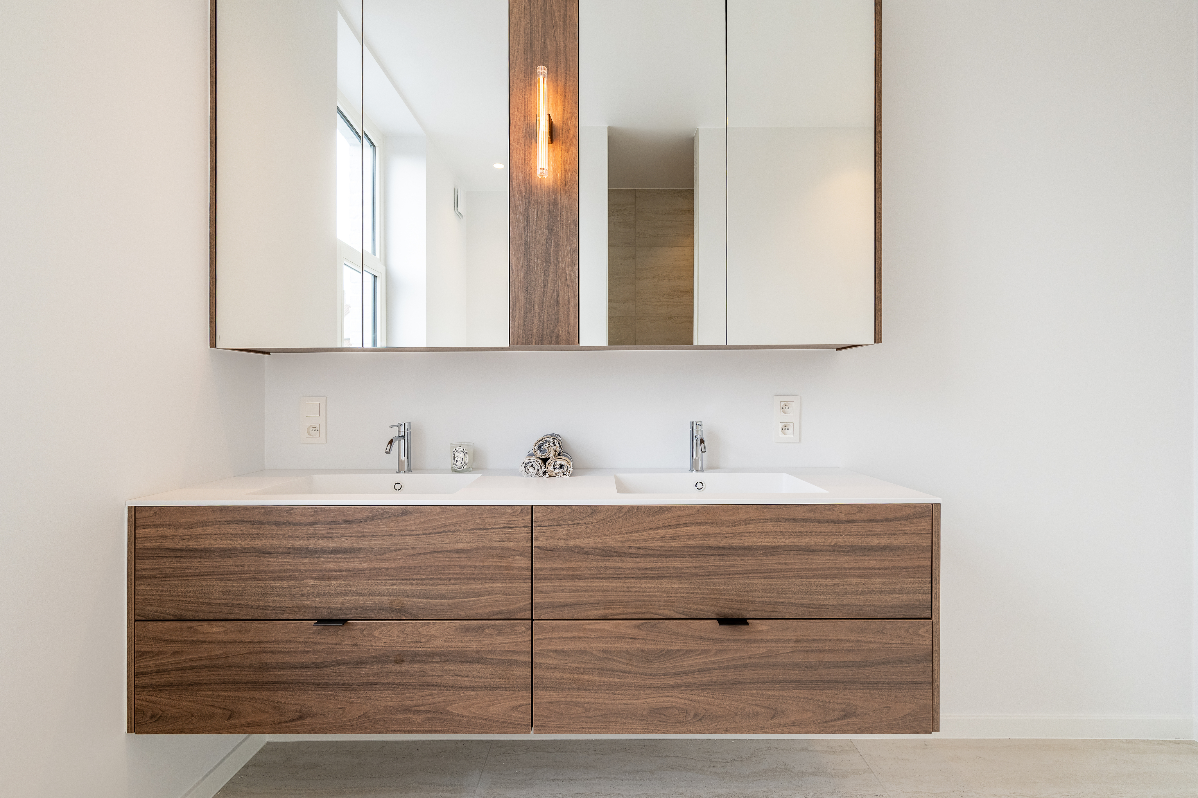 De eerste verdieping herbergt de masterbedroom met een volledig ingerichte dressing op maat, een ruime badkamer met ligbad, inloopdouche, dubbele wastafel en spiegelkast, evenals een apart toilet.