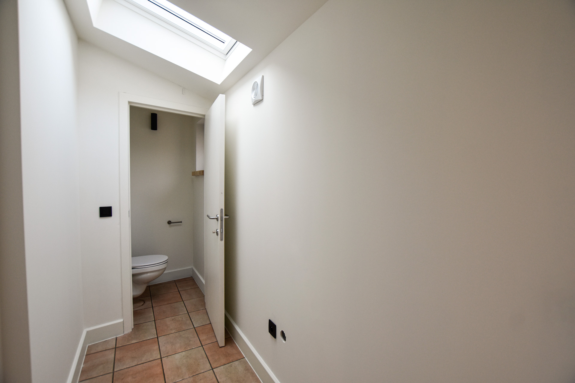 Het gelijkvloers beschikt eveneens over een praktische berging, uitgerust met aansluitingen voor wasmachine en droogkast en een apart gastentoilet, een absolute meerwaarde in een stadswoning.