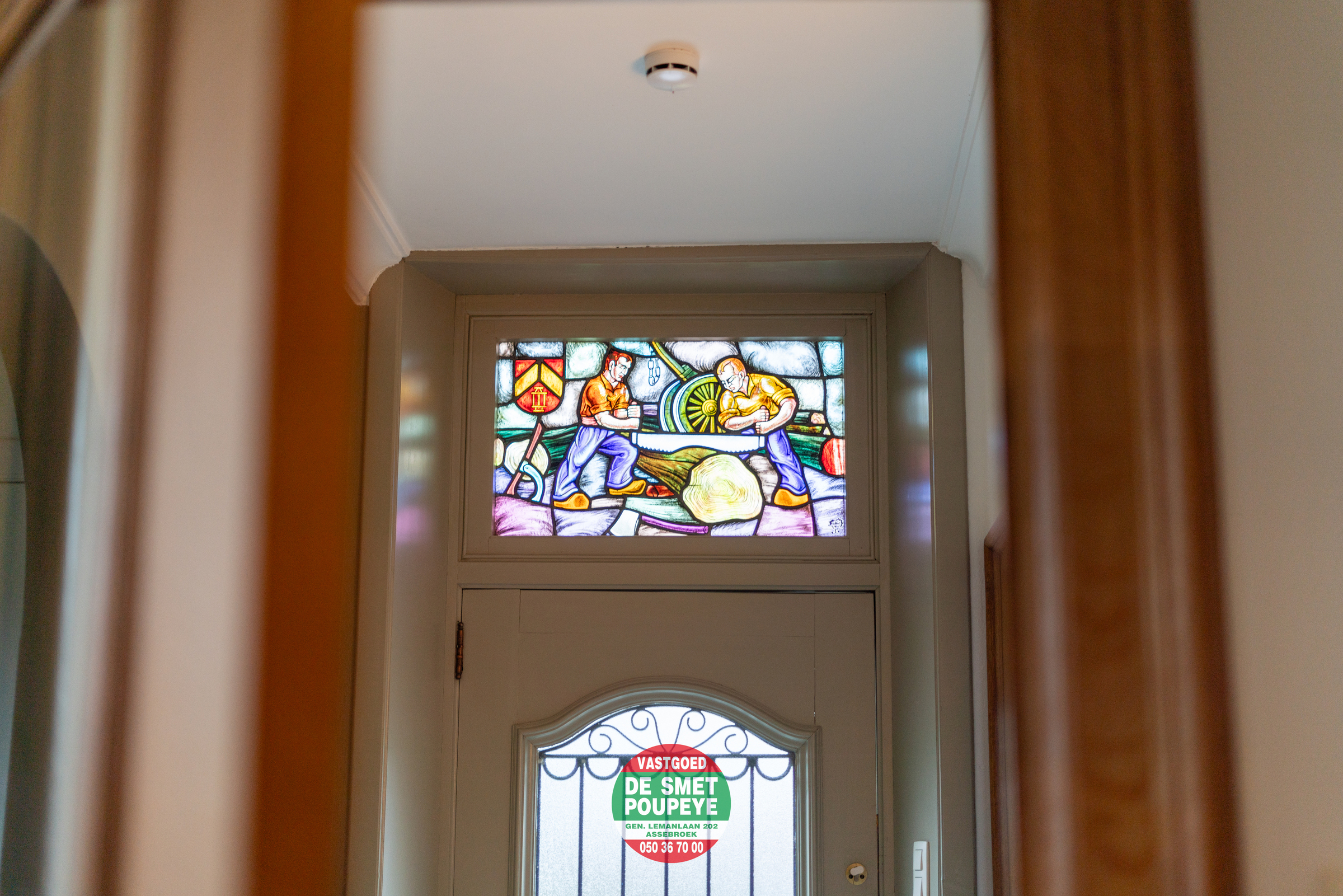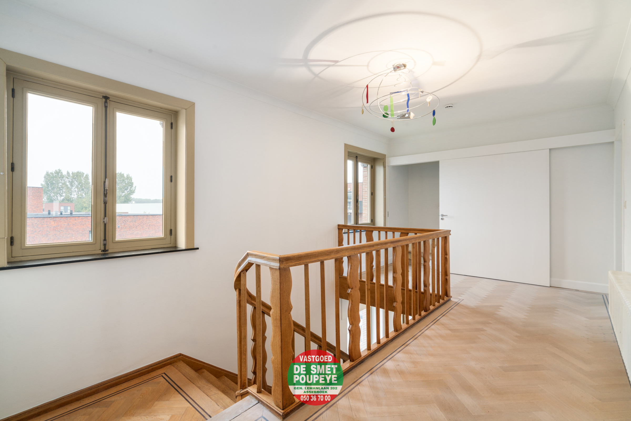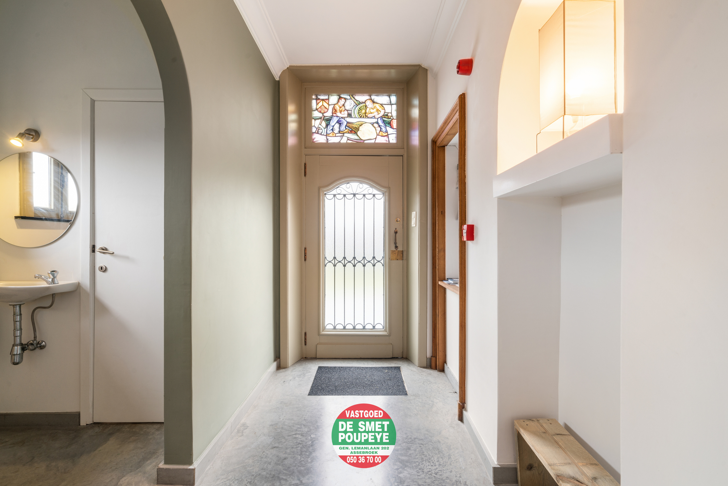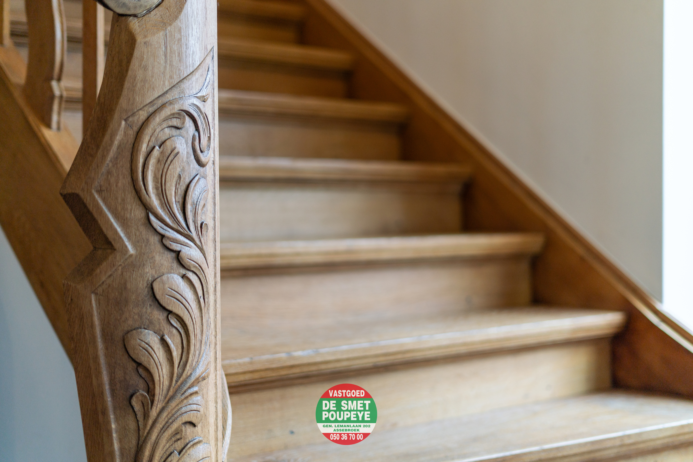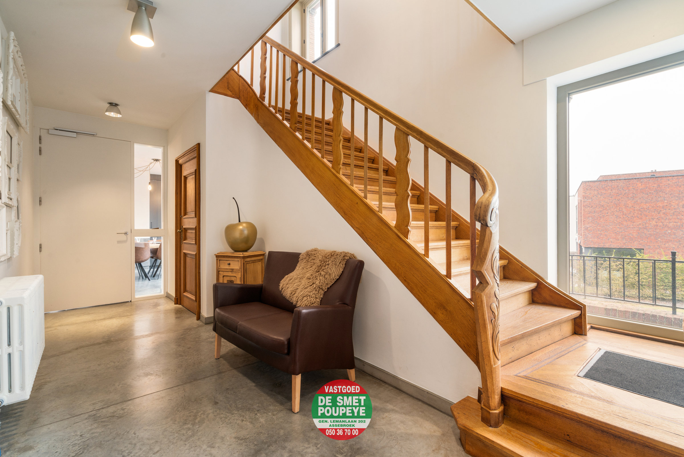 De inkomhal met authentieke trap en hoge plafonds leidt naar de ruime leefkeuken van 44 m² en de gezellige leefruimte afgewerkt met visgraatparket.
