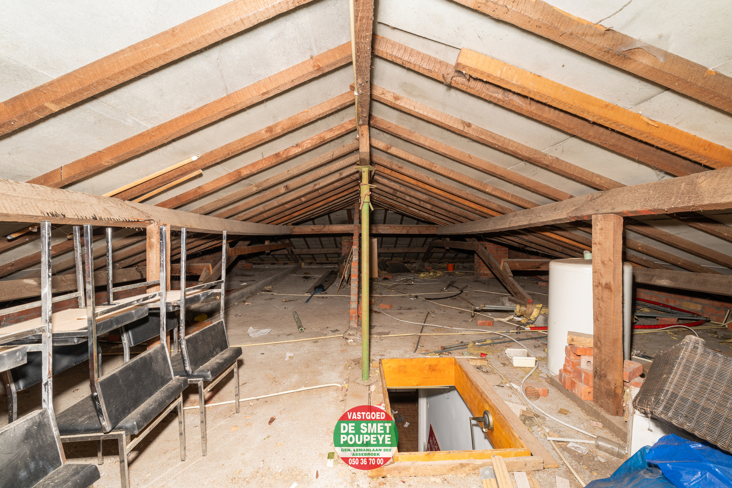 Achteraan het perceel bevindt zich een ruim bijgebouw/garage van ca. 100 m² in 2 verdiepen, bereikbaar via de oprit. Deze ruimte biedt tal van mogelijkheden als atelier, opslagruimte of werkplaats, ideaal voor zelfstandigen of hobbyisten.