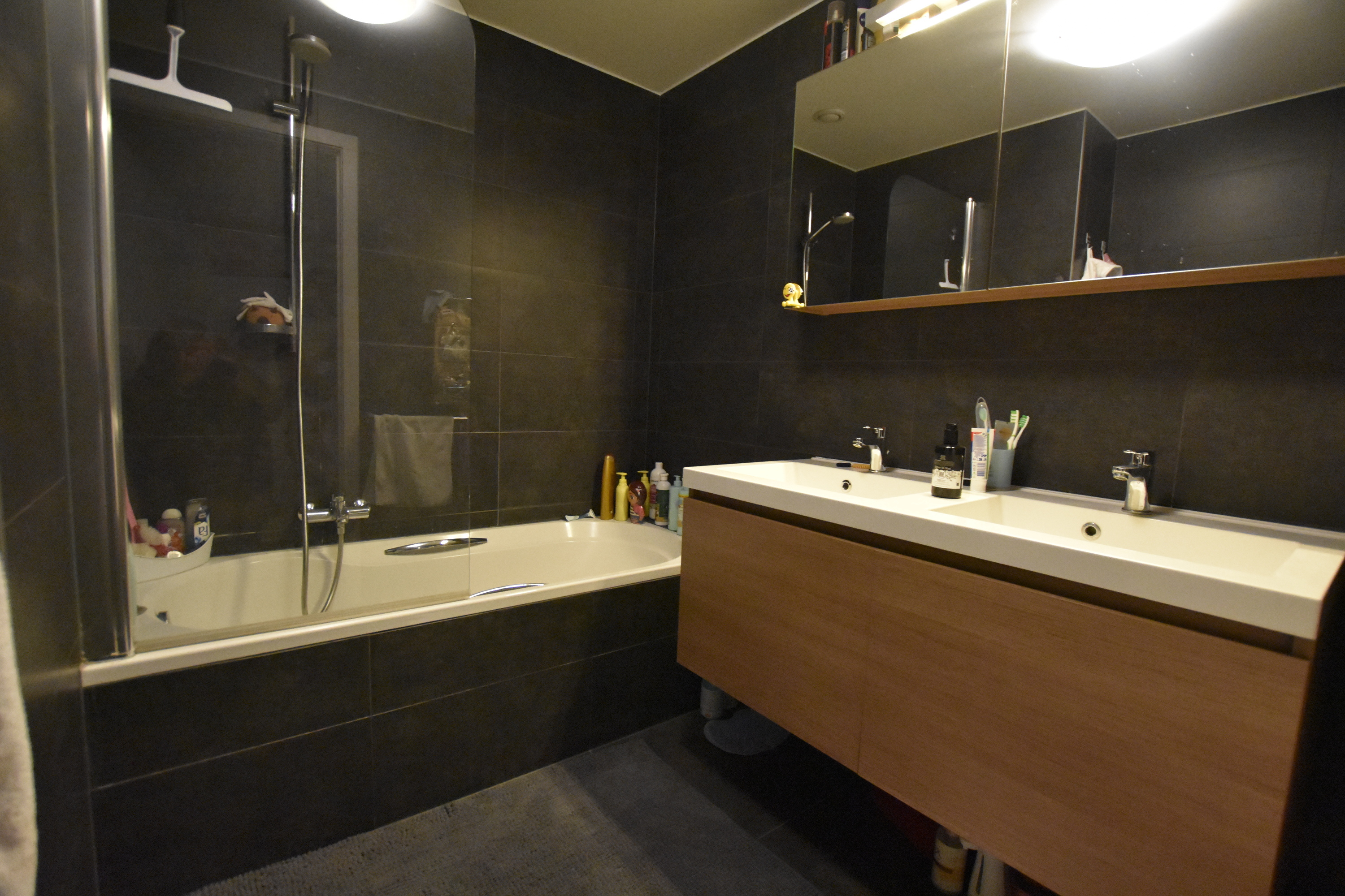 De badkamer is stijlvol ingericht en beschikt over een ligbad met douchecombinatie en een dubbele lavabo in een modern meubel. Verder zijn er twee volwaardige slaapkamers, ideaal voor een gezin, een koppel of als extra ruimte voor hobby’s of thuiswerk. In de kelderverdieping is er nog een extra berging voorzien, en buiten kunt u genieten van een ruim terras.