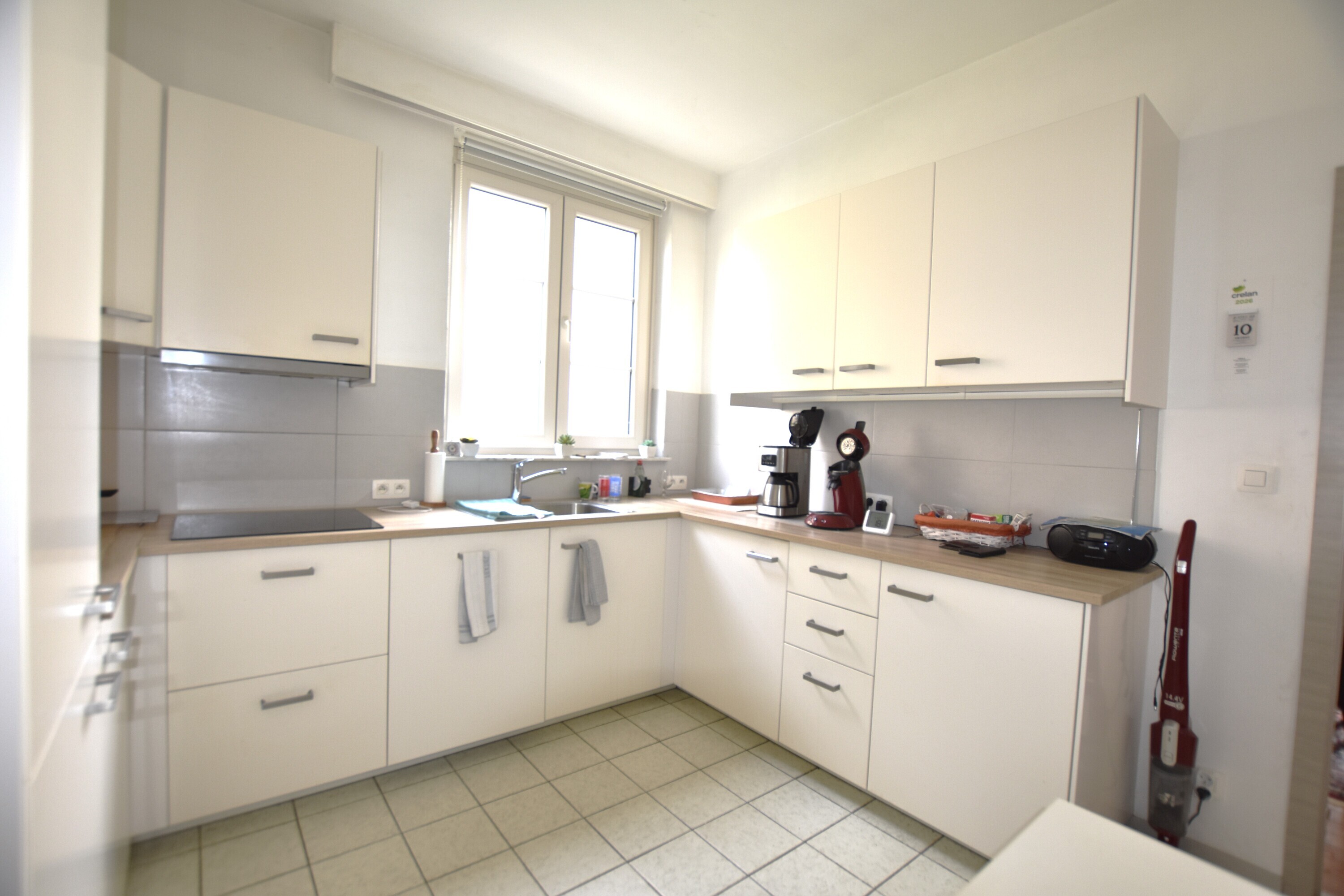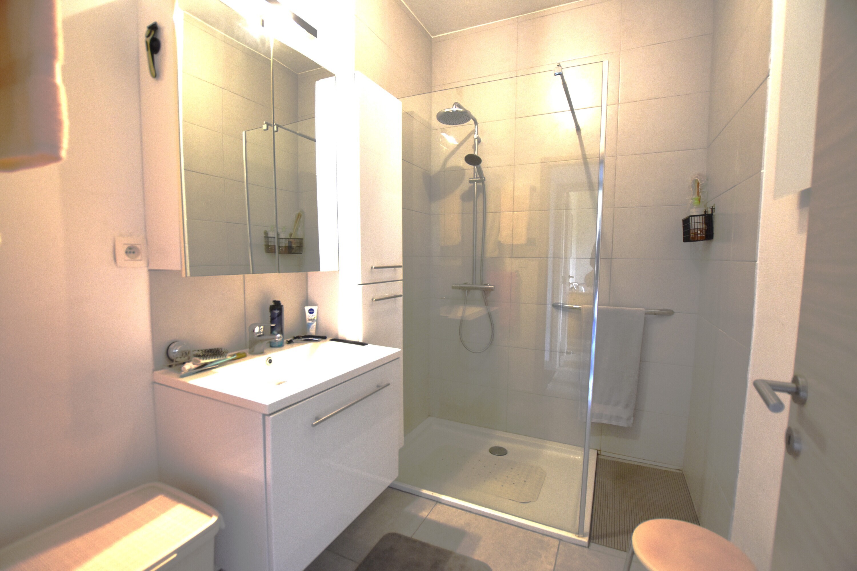 Het appartement bestaat uit een inkomhal met gastentoilet, een lichtrijke living en een keuken uitgerust met vaatwasmachine, koelkast en inductiekookplaat. Aansluitend is er een praktische berging met aansluiting voor een wasmachine. Verder beschikt het appartement over twee slaapkamers, waarvan één slaapkamer toegang biedt tot de gemeenschappelijke tuin - een aangename extra om van het buitengevoel te genieten. De badkamer is uitgerust met een moderne inloopdouche en een lavabo verwerkt in een meubel.