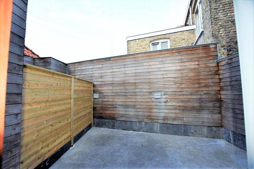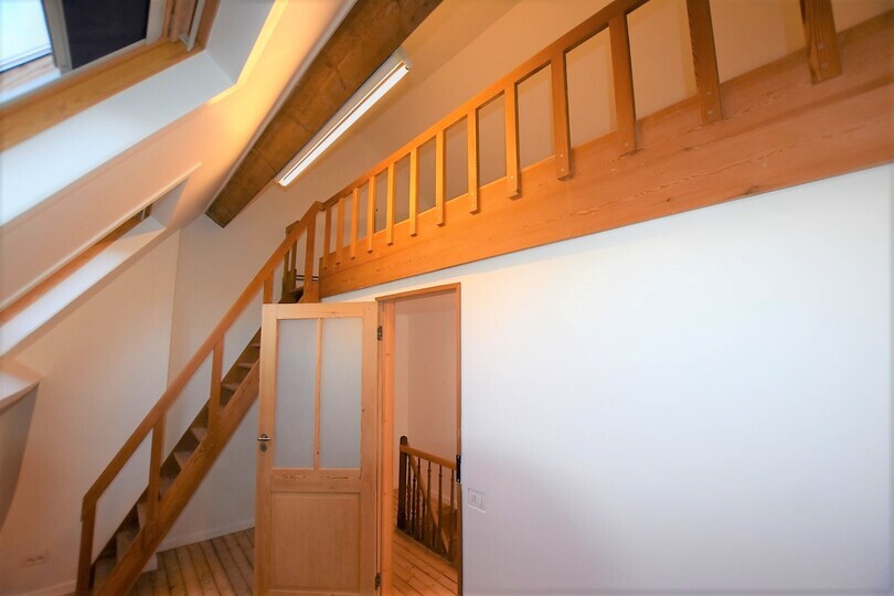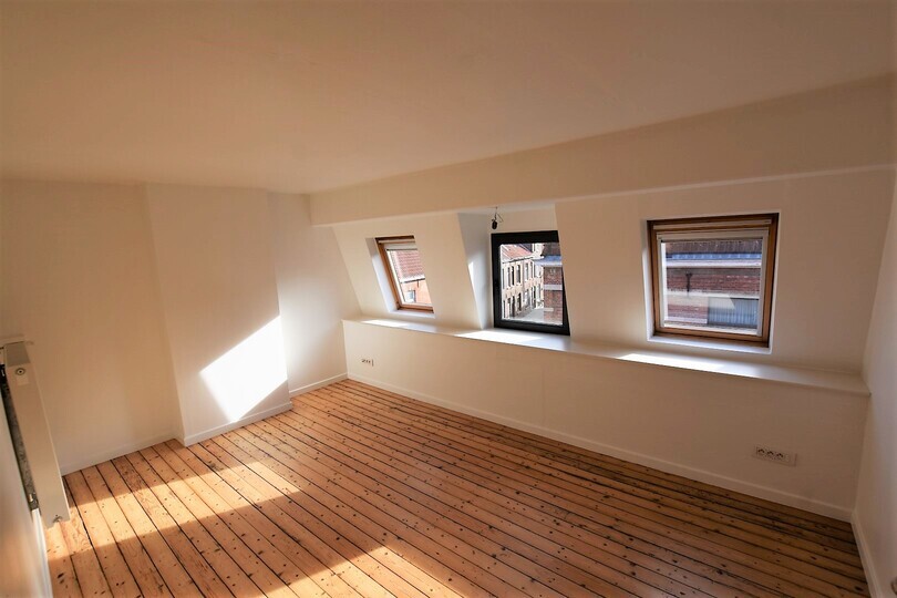 Via de inkomhal kom je in de lichtrijke living met parketvloer. Aansluitend bevindt zich de open keuken, volledig ingericht met koelkast, oven, keramische kookplaat, dampkap en vaatwasmachine. Vanuit de living heb je toegang tot het zonnige stadsterras, een rustige buitenruimte waar je op elk moment van de dag kan ontspannen.