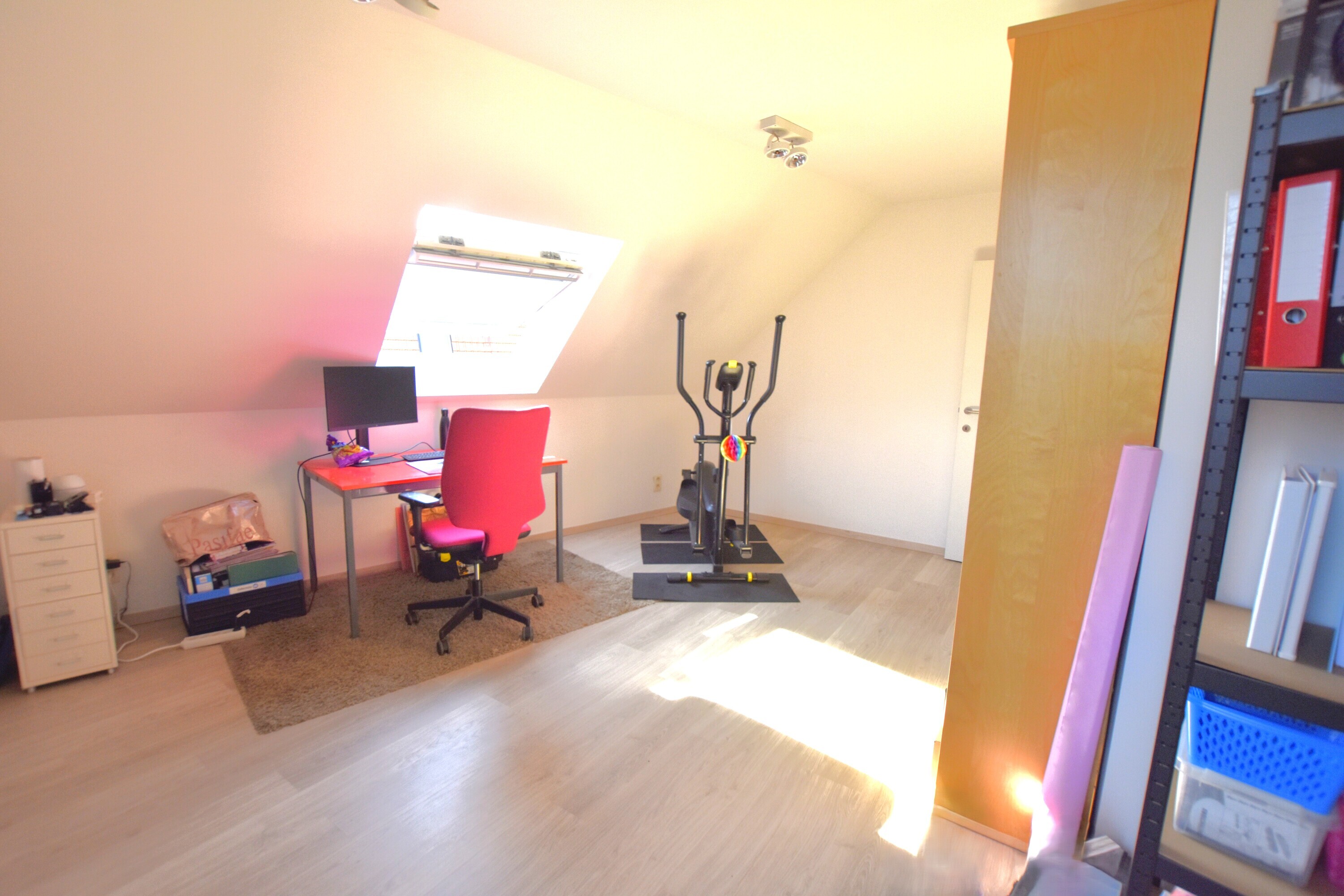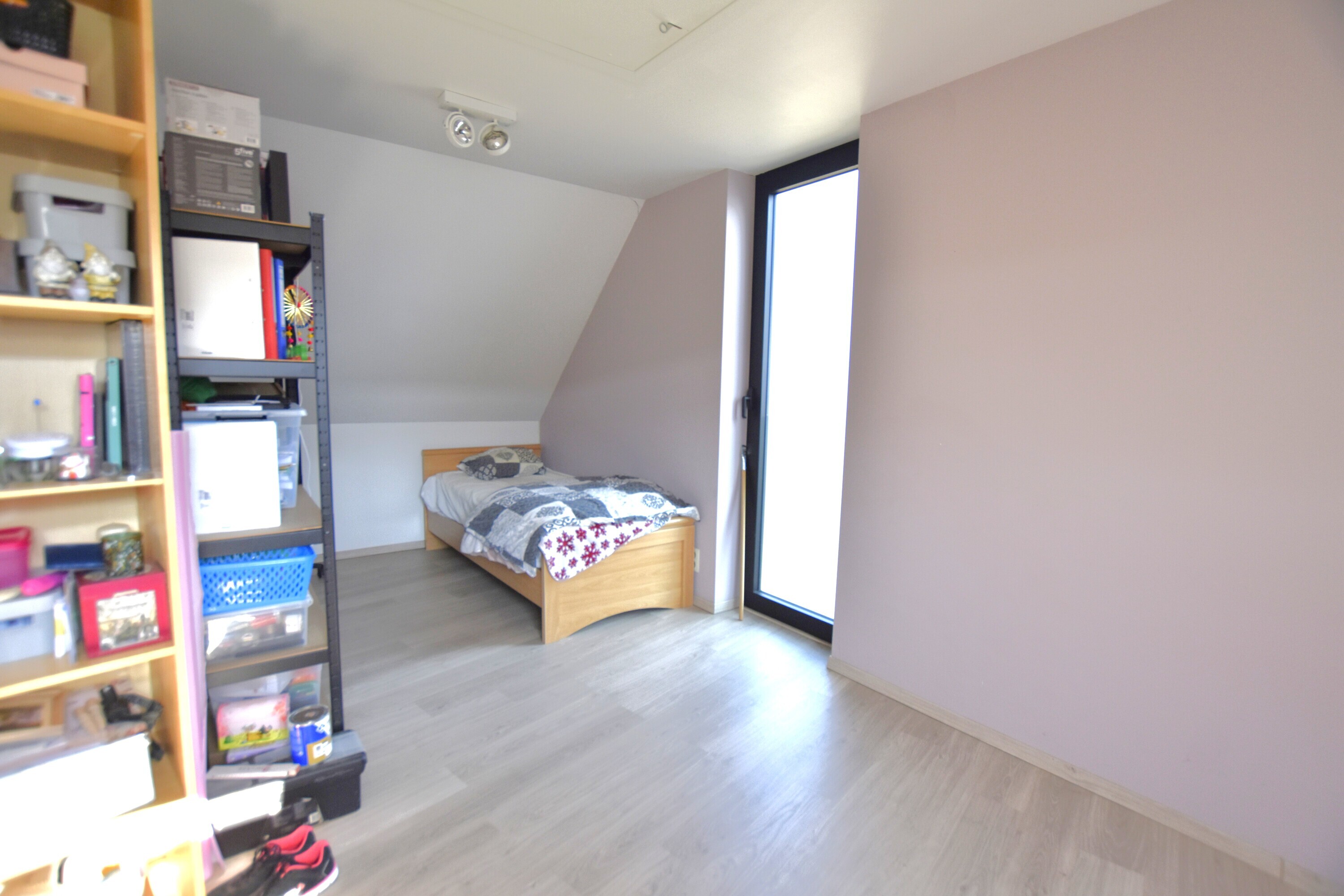 Op de bovenste verdieping bevindt zich de derde slaapkamer, vormgegeven in een functionele L-vorm. Dankzij de indeling en oppervlakte kan deze ruimte dienen als bureau, hobbykamer, logeerruimte of atelier.