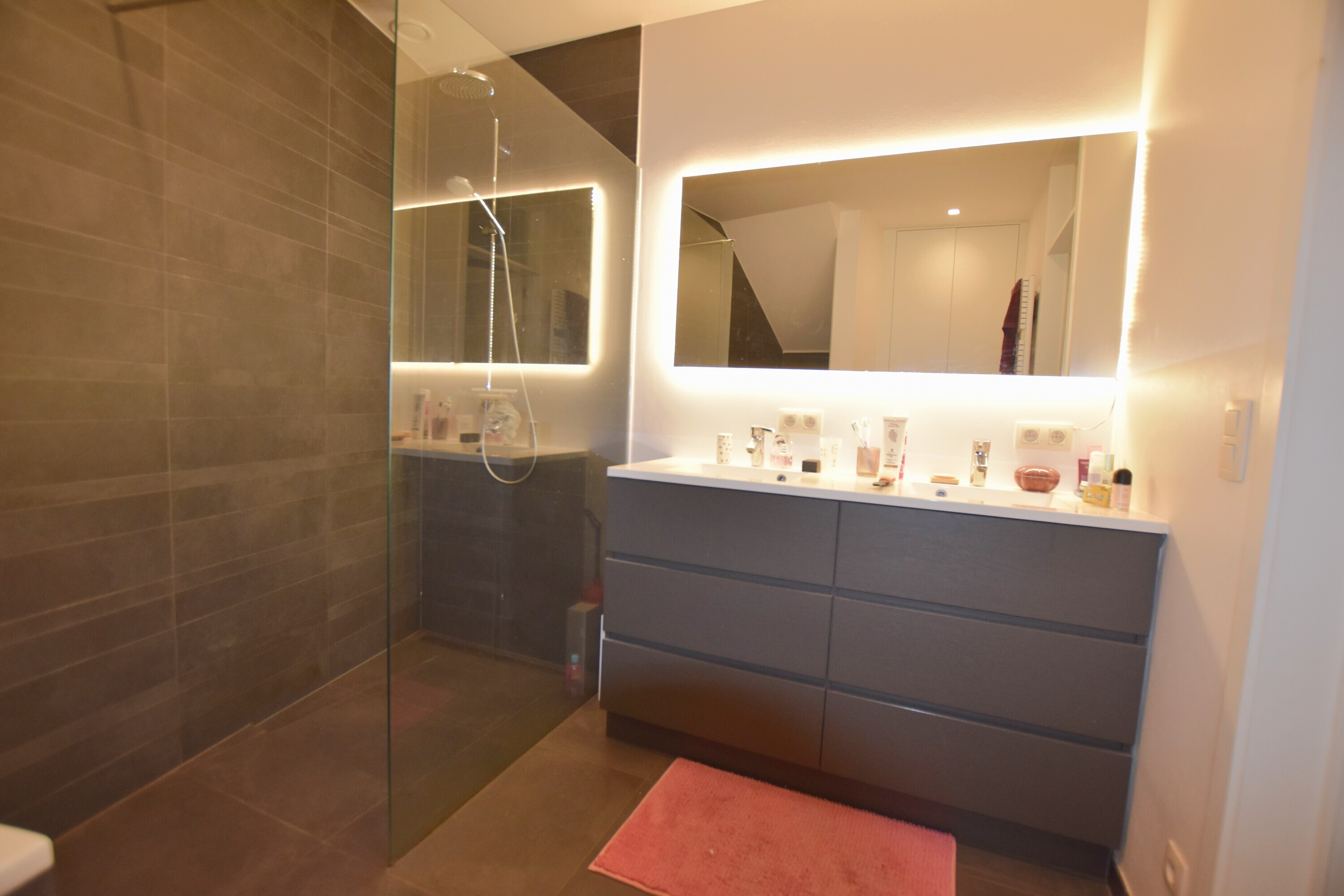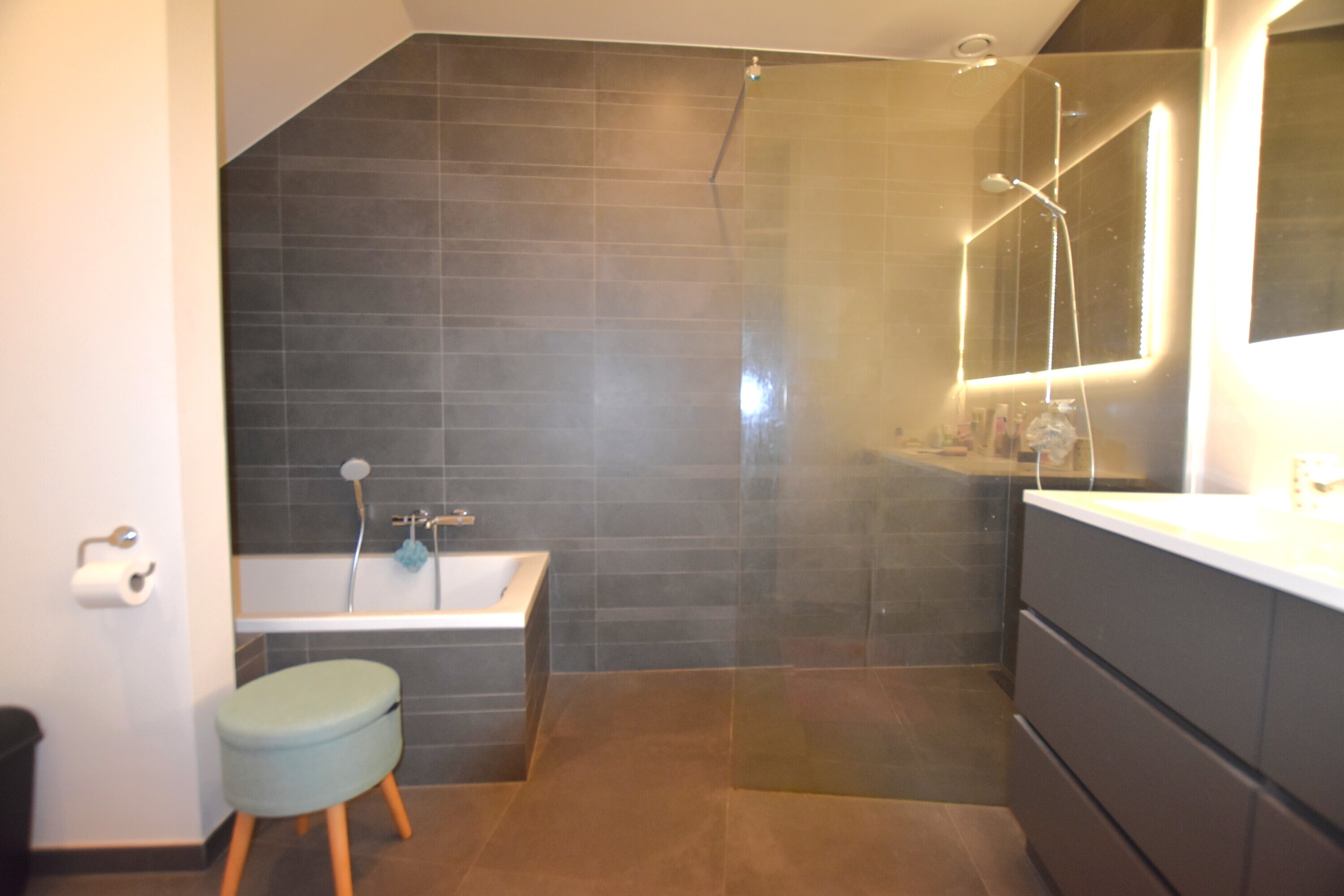 Bij het betreden van de woning komt u binnen in een aangename inkomhal die toegang biedt tot de verschillende ruimtes en de trap naar de eerste verdieping. Op het gelijkvloers bevinden zich twee volwaardige slaapkamers en een moderne, volledig ingerichte badkamer, uitgerust met een ligbad, ruime inloopdouche, dubbele lavabo en toilet.