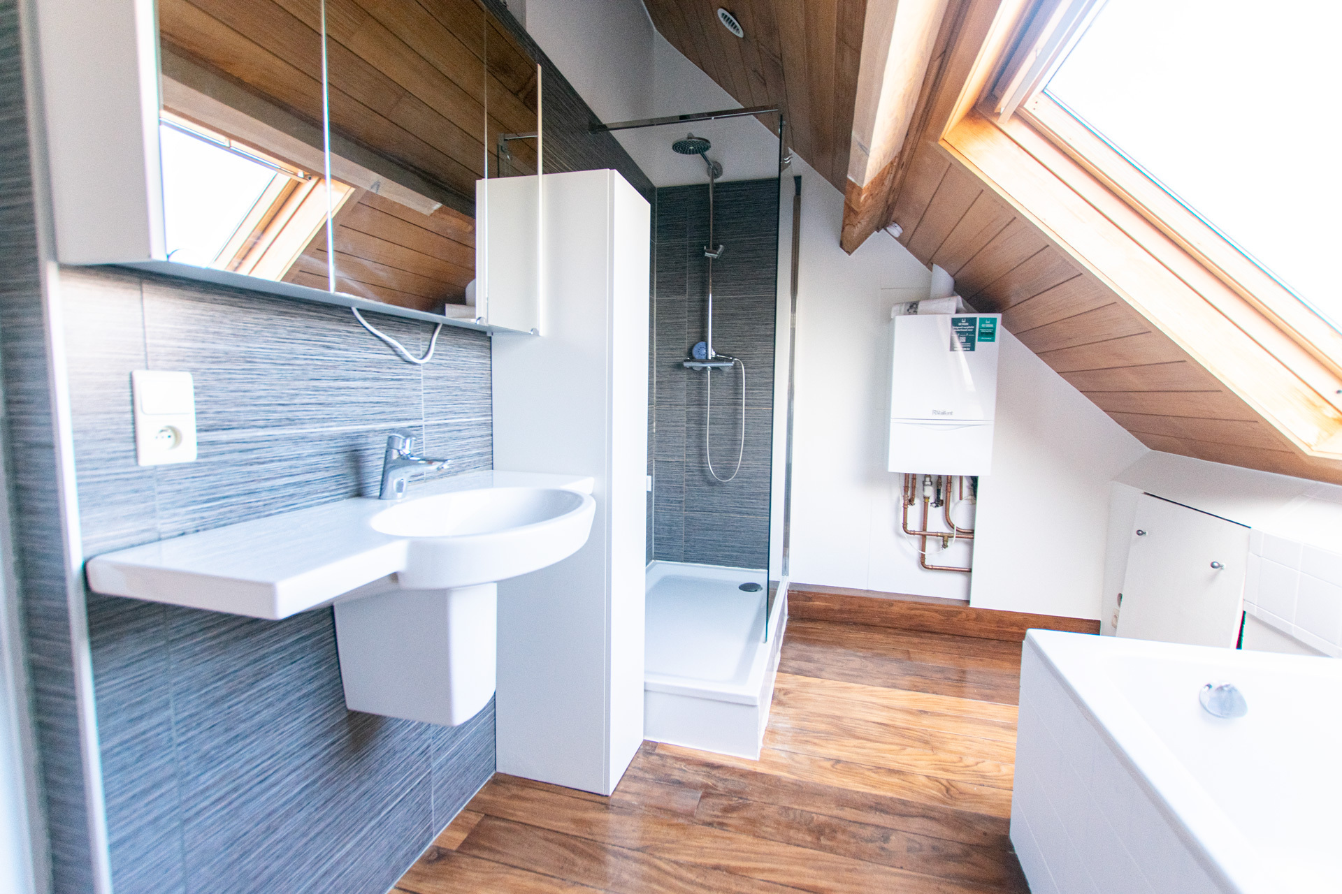 Op de eerste verdieping bevindt zich een tweede living, perfect als tv-hoek, speelkamer of bureau, samen met een slaapkamer. De tweede verdieping biedt twee comfortabele slaapkamers, terwijl op de derde verdieping nog een extra slaapkamer te vinden is. Hier bevindt zich ook de badkamer, voorzien van een ligbad, douche, dubbele lavabo, toilet en aansluitingen voor wasmachine en droogkast.