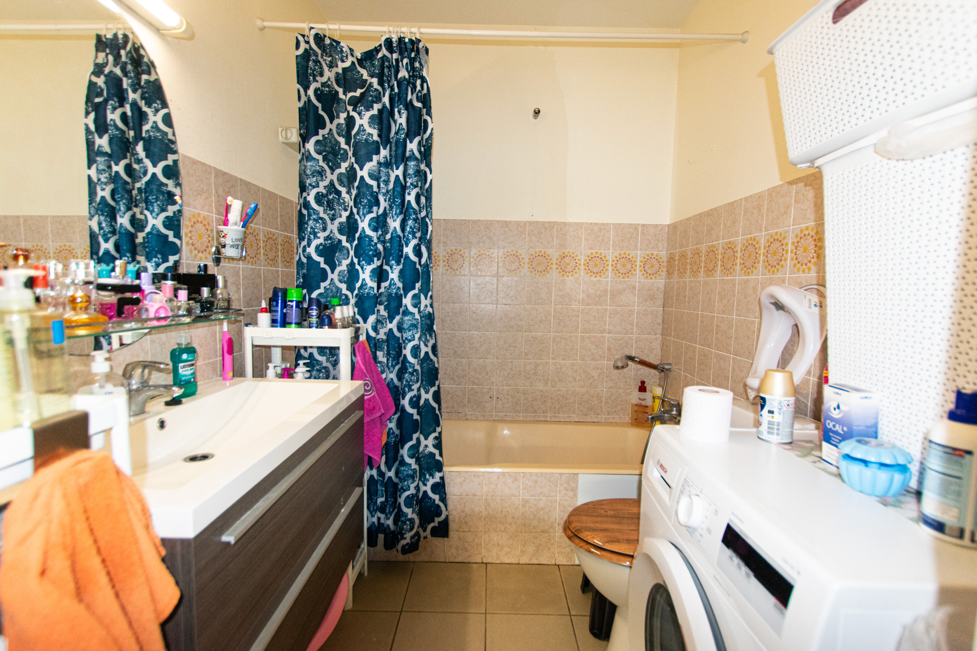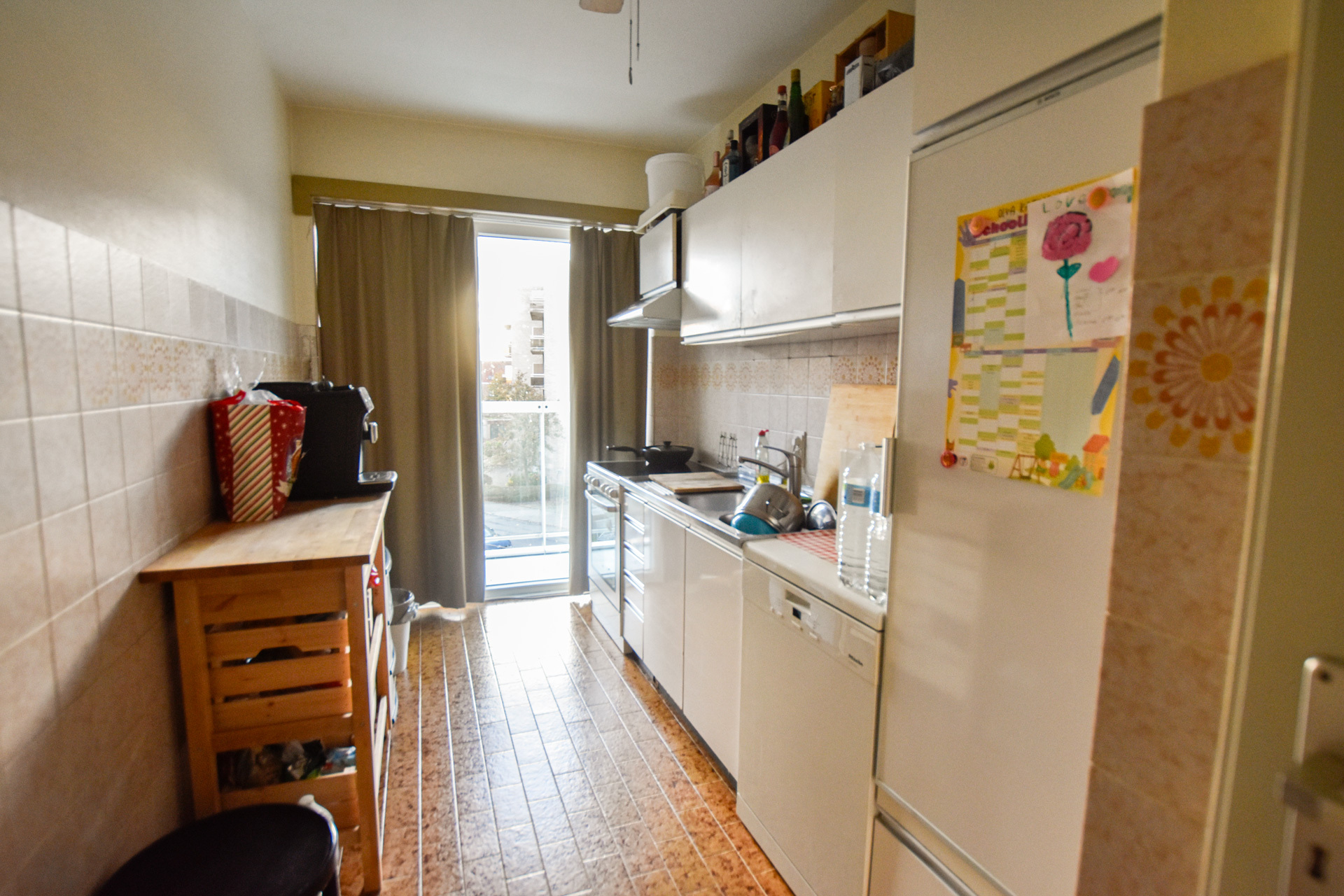 Bij het betreden van het appartement komt u binnen in een inkomhal, voorzien van praktische ingemaakte kasten die zorgen voor extra opbergruimte. Hier bevindt zich tevens een gastentoilet. De aangename leefruimte baadt in het natuurlijke licht dankzij de grote raampartijen, en biedt voldoende plaats voor een comfortabele zit- en eethoek. Aansluitend vindt u de ingerichte keuken met extra bergruimte.