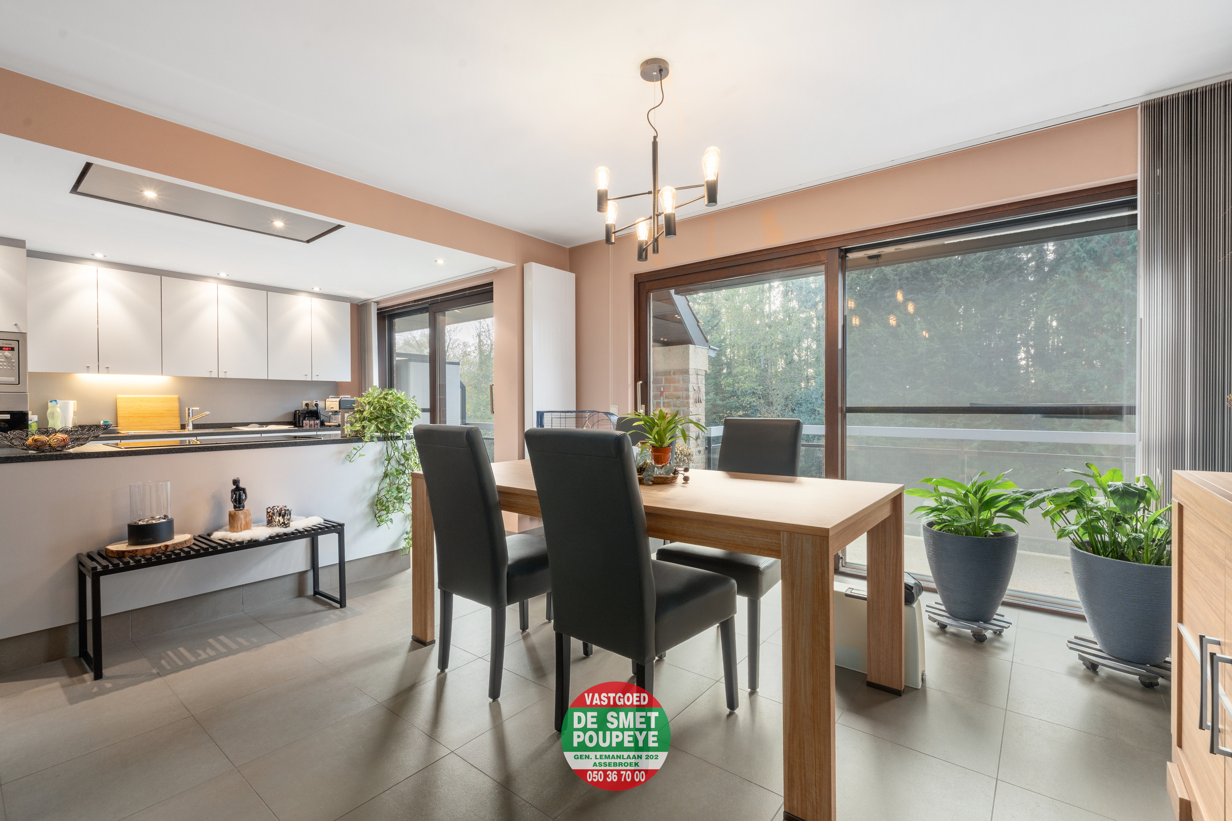 Via de inkomhal met vestiaire en gastentoilet bereik je de grote, lichtrijke leefruimte met toegang tot het eerste zuidwest gericht terras. Aansluitend bevindt zich de open keuken met eiland en alle toestellen. Vanuit de keuken heb je toegang tot het tweede zuidwest gericht terras, een aangename plek om te genieten van de middag- en avondzon.