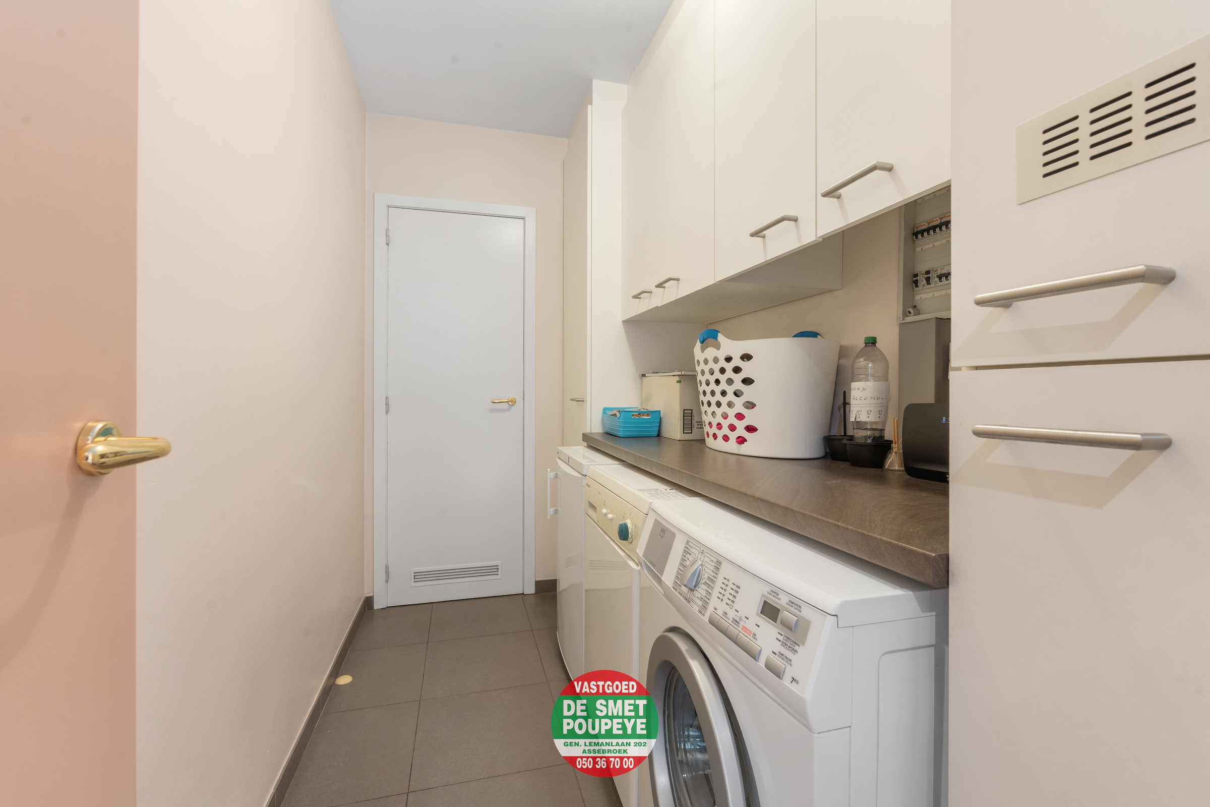 Daarnaast is er een praktische wasberging, volledig uitgerust met hoogwaardige maatkasten. Het appartement telt twee slaapkamers en een comfortabele badkamer met inloopdouche, wastafel en een extra toilet.