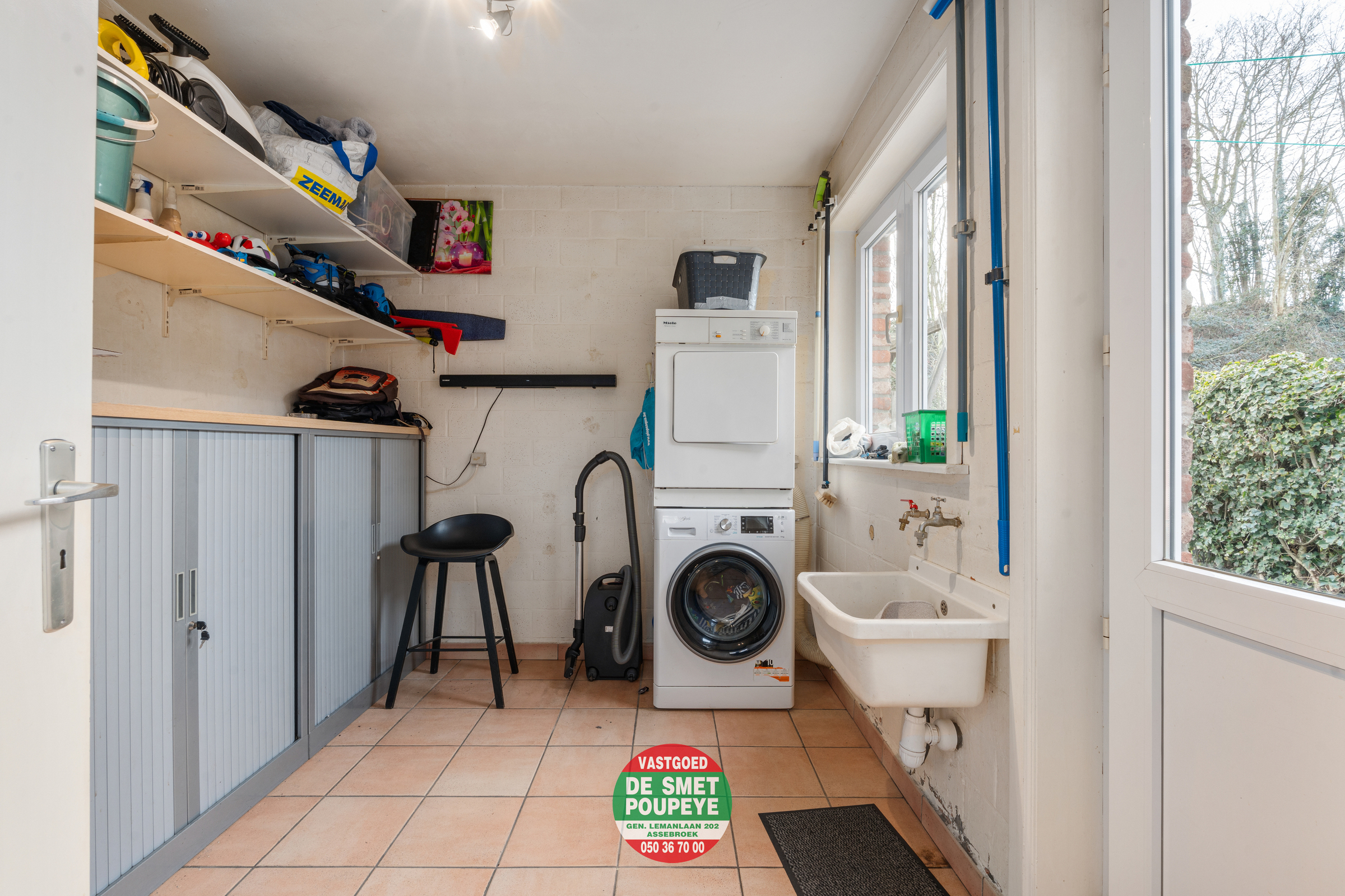 Op het gelijkvloers bevindt zich de inkomhal met vestiaire en gastentoilet, gevolgd door een aangename leefruimte met eet- en zitgedeelte. Aansluitend is er de volledig geïnstalleerde keuken met ontbijtmogelijkheid, een extra berging en een aparte wasplaats.