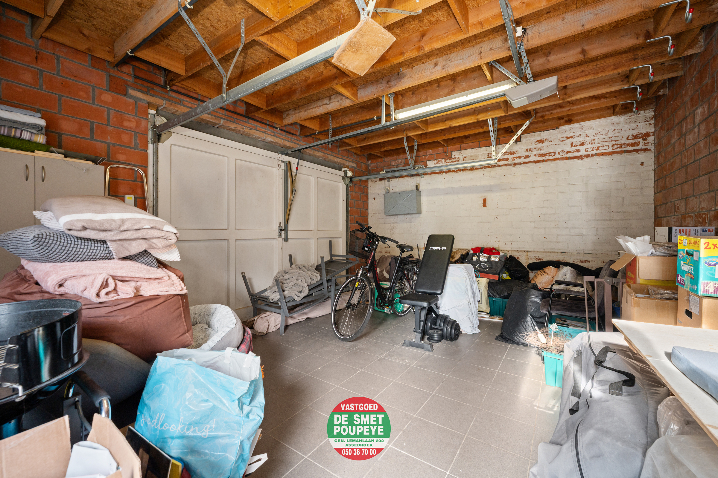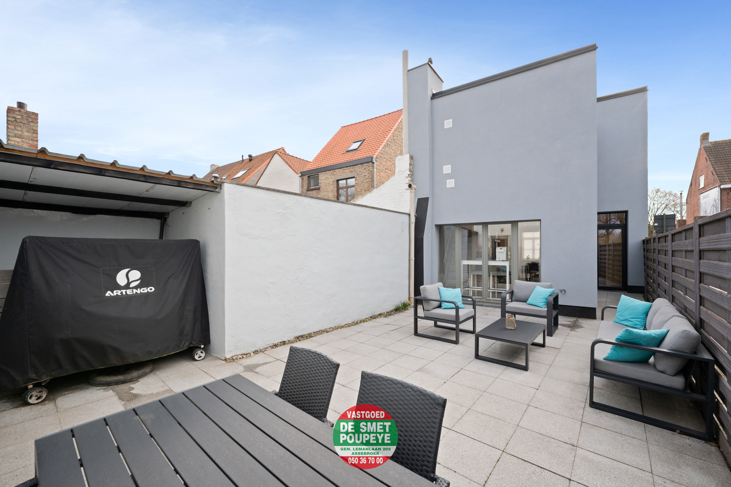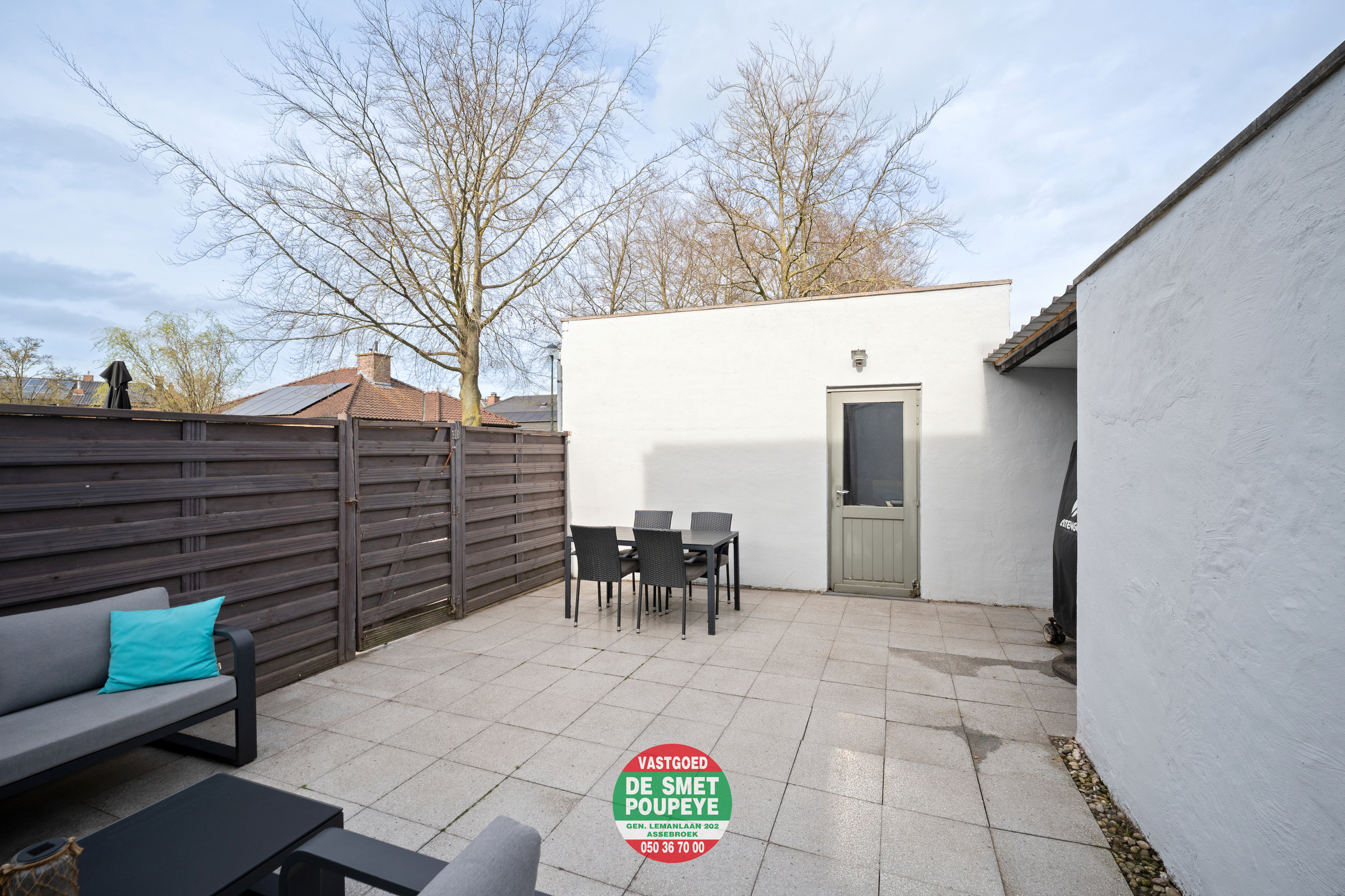 Zowel vanuit de leefruimte als de keuken is er toegang tot het zonnige terras, dat rechtstreeks aansluit op de ruime garagebox van 25 m² — een bijzonder praktische troef voor parkeren, opslag of hobby.