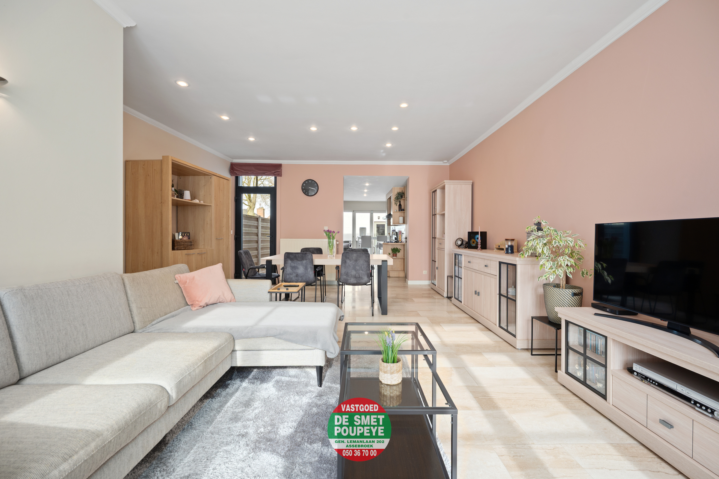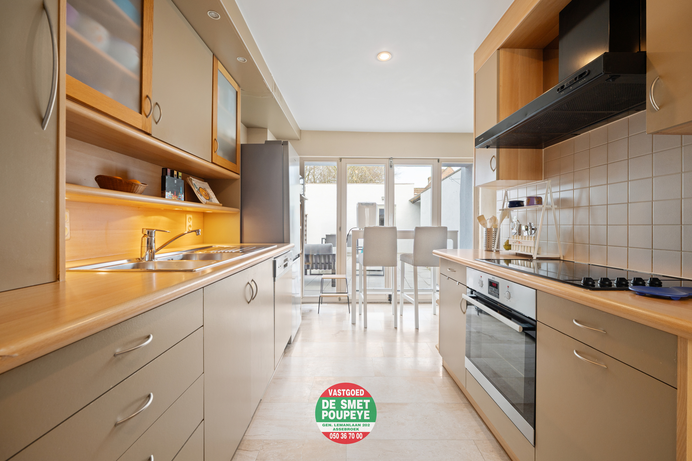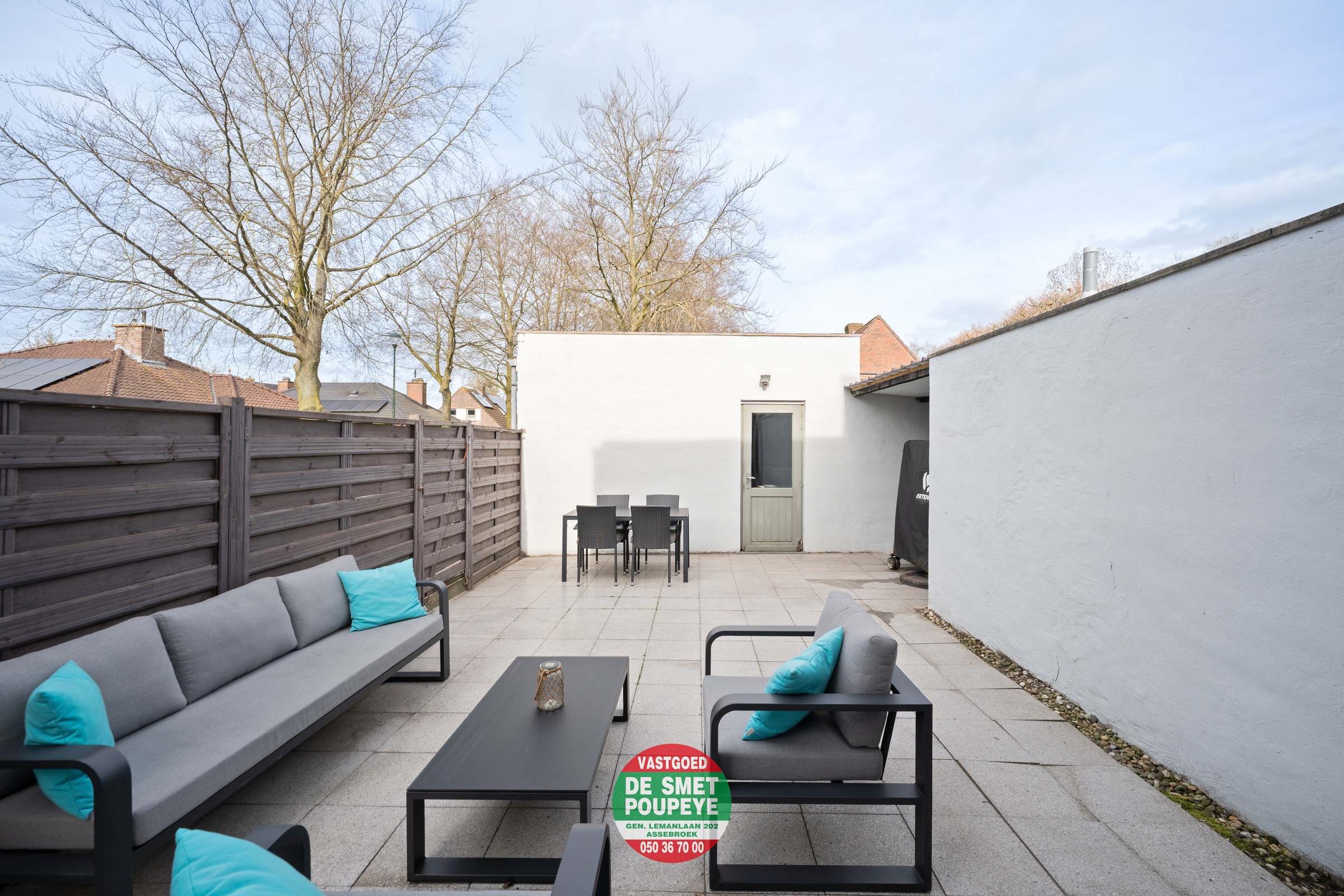 Zowel vanuit de leefruimte als de keuken is er toegang tot het zonnige terras, dat rechtstreeks aansluit op de ruime garagebox van 25 m² — een bijzonder praktische troef voor parkeren, opslag of hobby.
