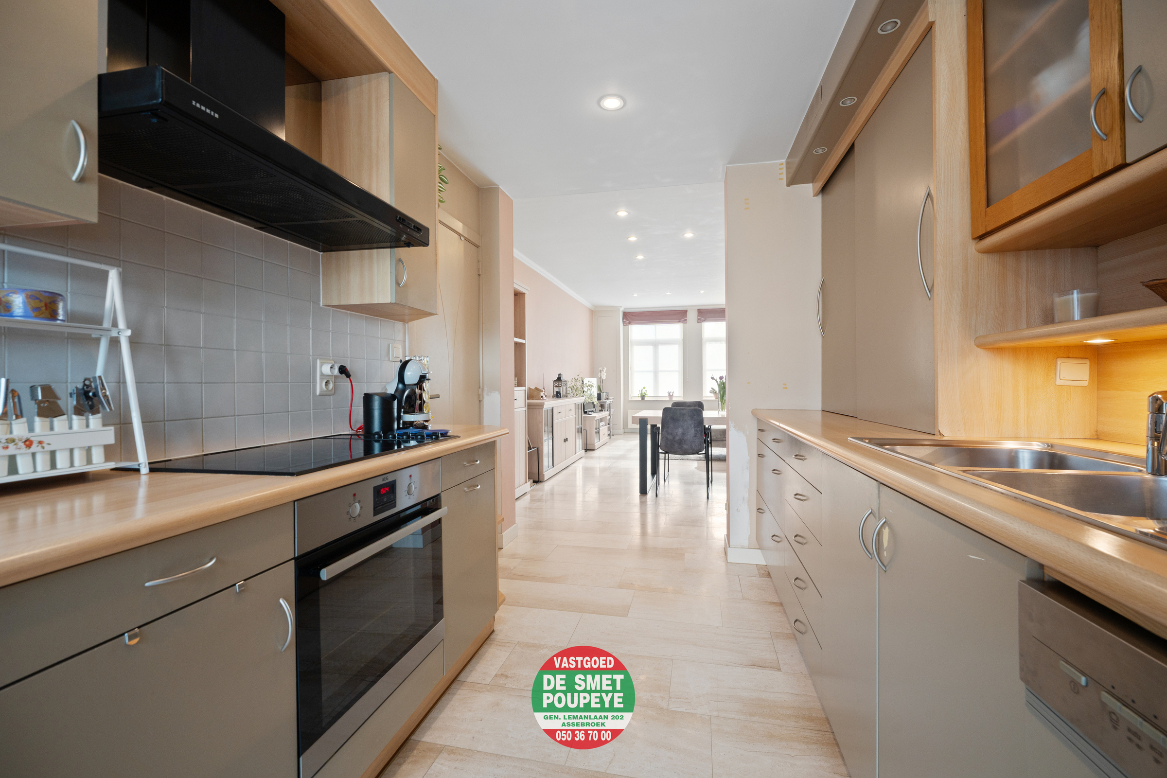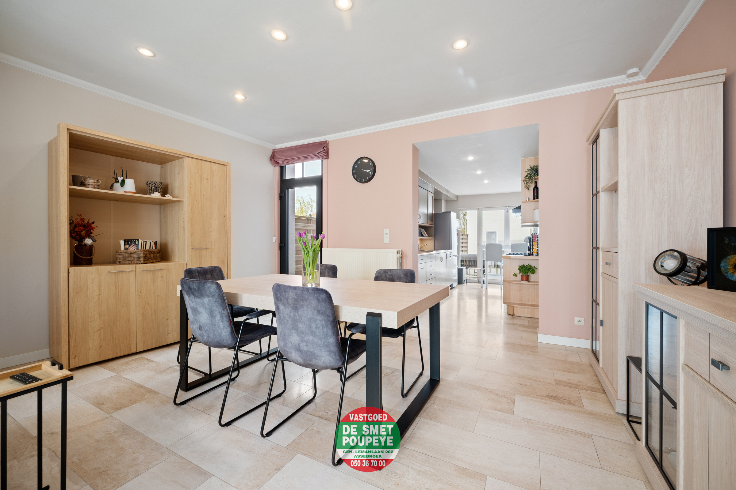 Via de inkomhal met vestiaire en gastentoilet betreedt men de lichtrijke leefruimte met eet- en zitgedeelte. Aansluitend bevindt zich de open keuken, volledig uitgerust met toestellen en met toegang tot de droge kelder, ideaal als extra bergruimte.