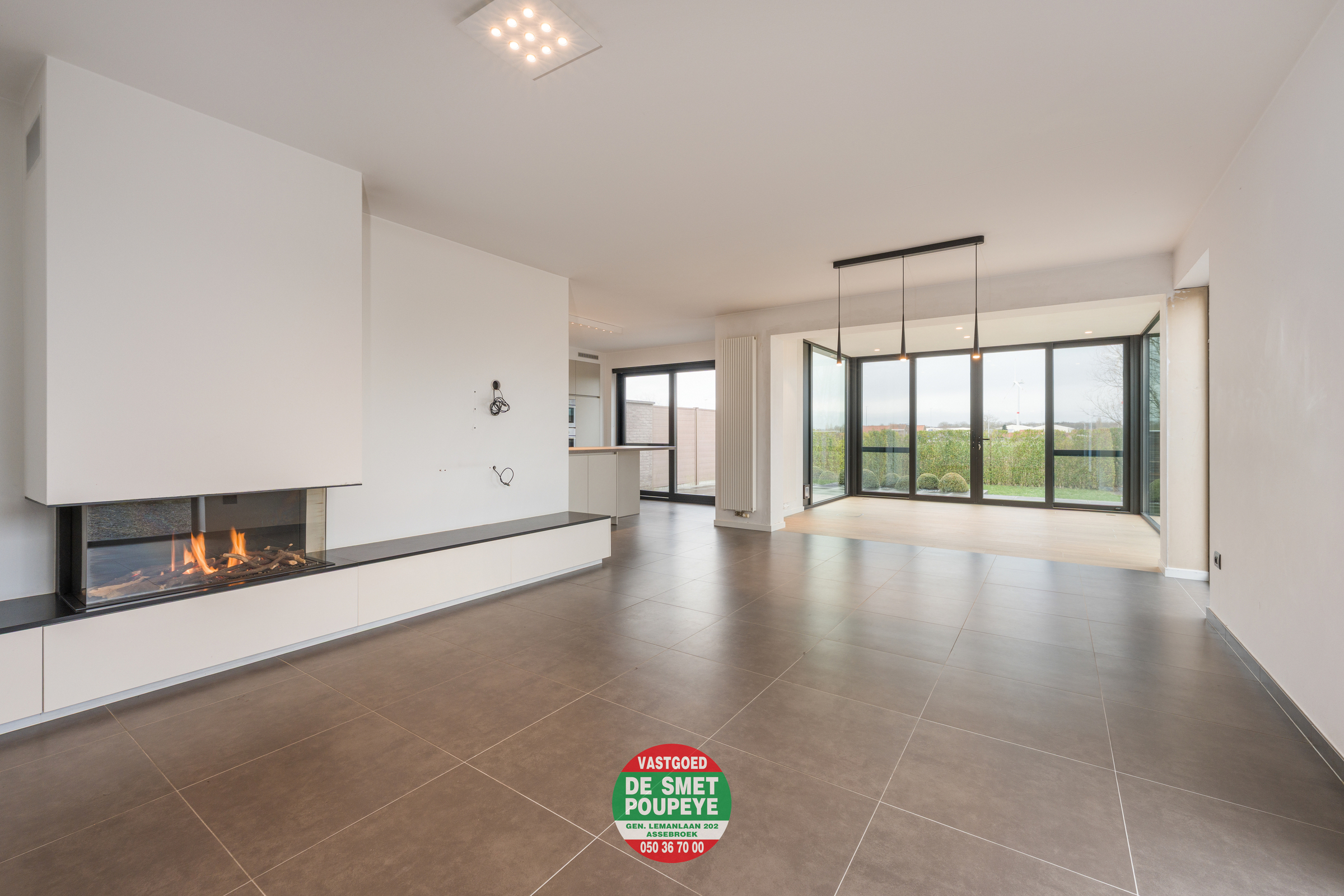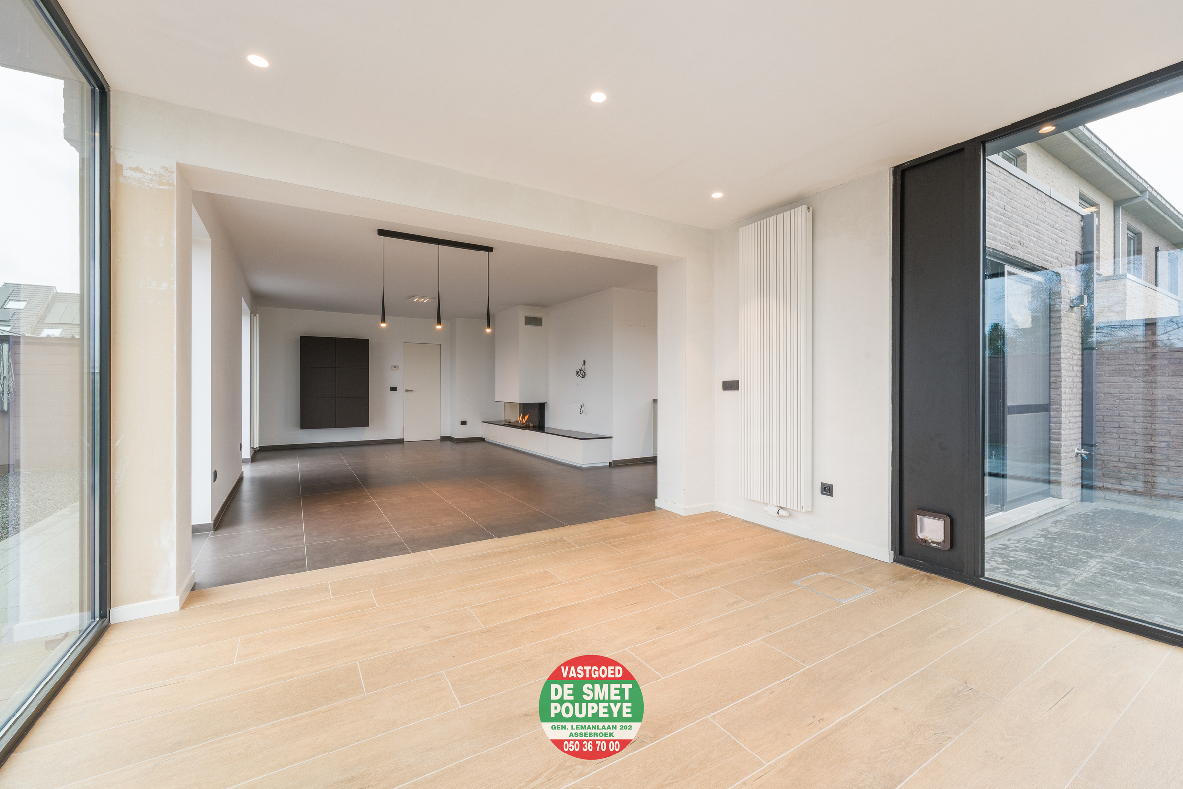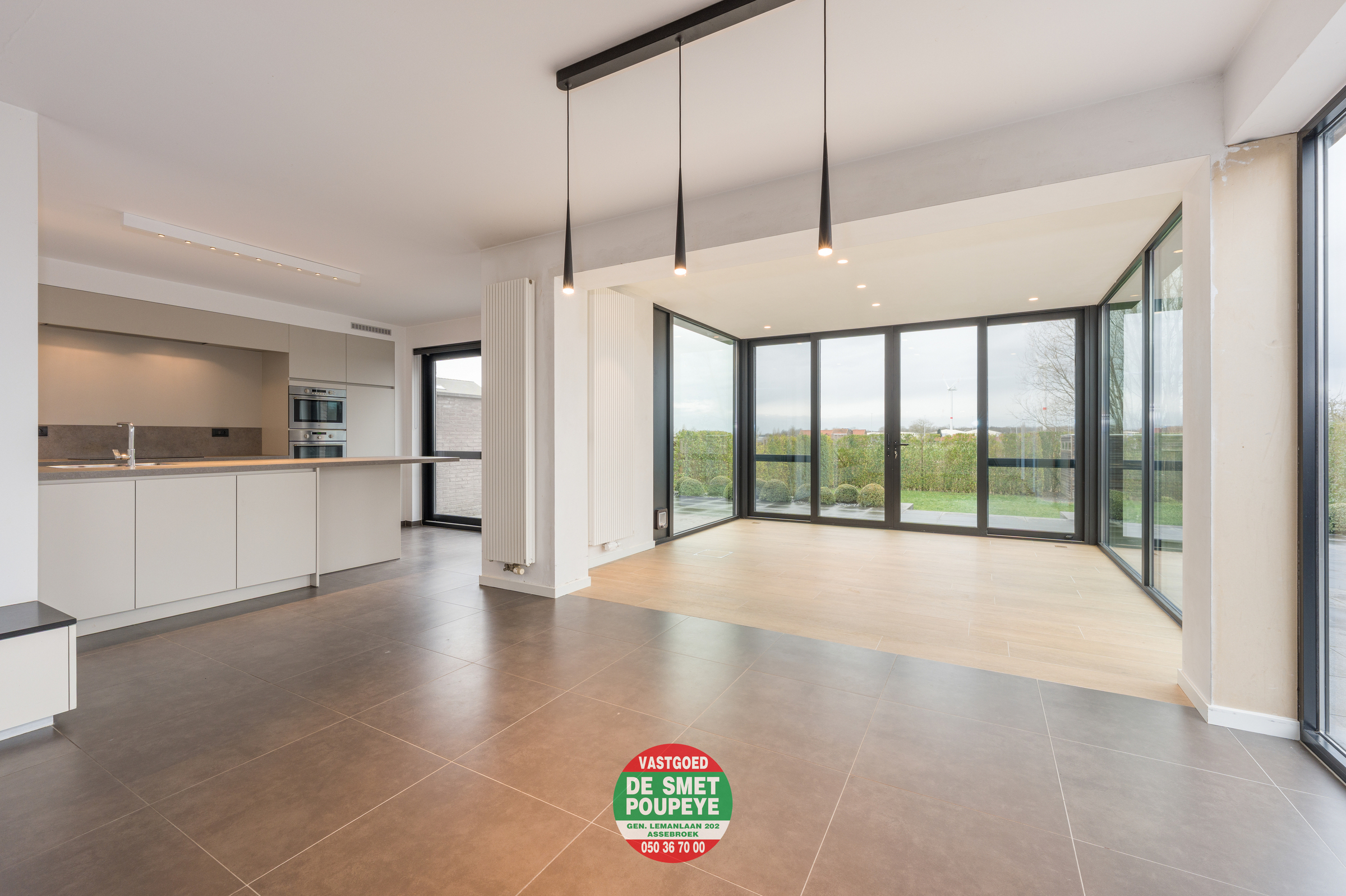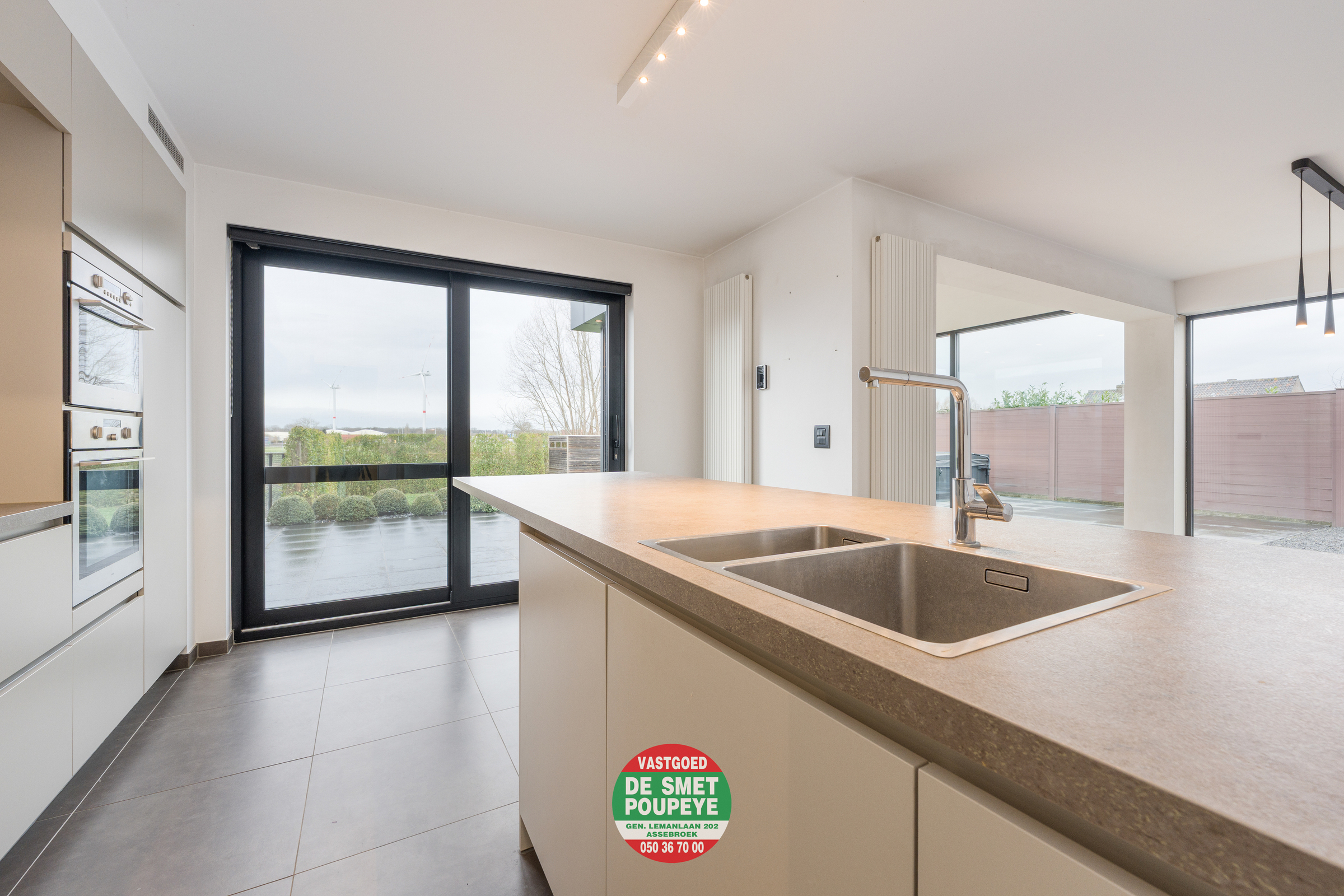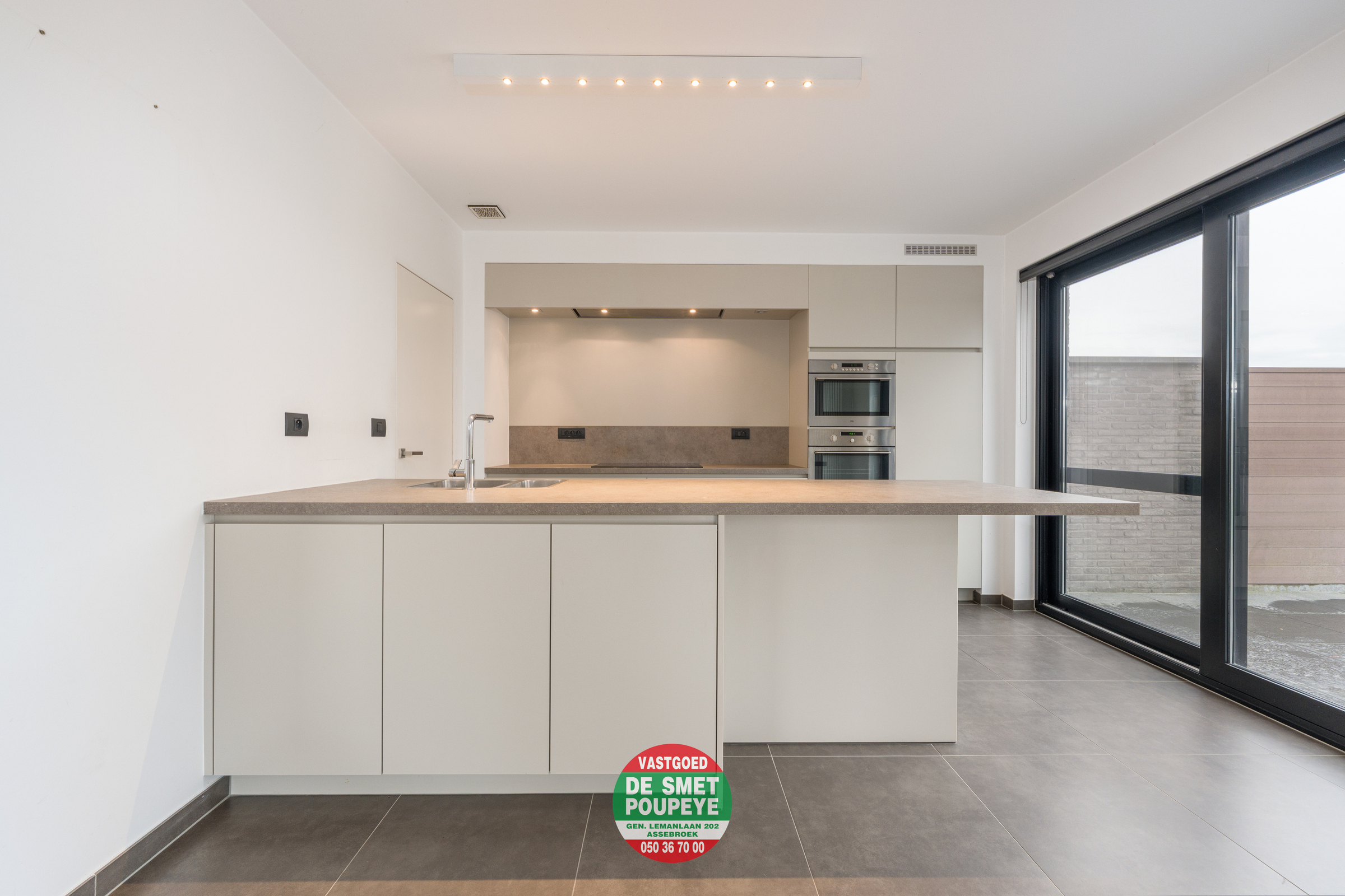 Op het gelijkvloers bevindt zich de inkomhal met vestiaire en gastentoilet, een praktische berging met aansluiting voor wasmachine en droogkast, en een ruime, open leefruimte met gezellige haard op gas. De open keuken is volledig uitgerust met alle hedendaagse toestellen. Het centrale keukeneiland biedt extra werkruimte en fungeert tegelijk als gezellige eetplaats. De keuken, de leefruimte én de nieuwe glazen aanbouwstaan in directe verbinding met elkaar en geven via grote raampartijen toegang tot de westgerichte tuin, ideaal om te genieten van de namiddag- en avondzon.
